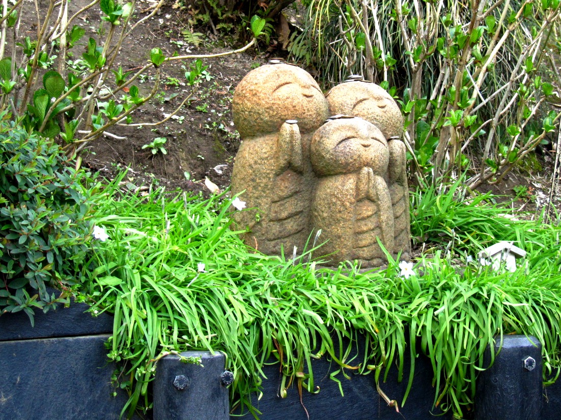 いくつかのゆるきゃらカエルの石像が…