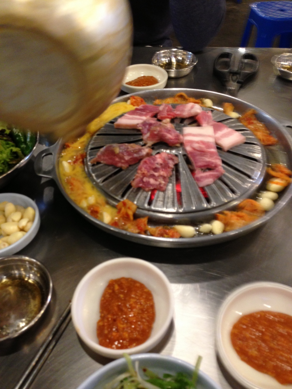 肉焼き台の縁にヤカンで卵を流し入れてくれて、ニンニク&キムチ&肉汁で美味しいケランチムが出来上がり、これがまた美味しいんですよね~~
