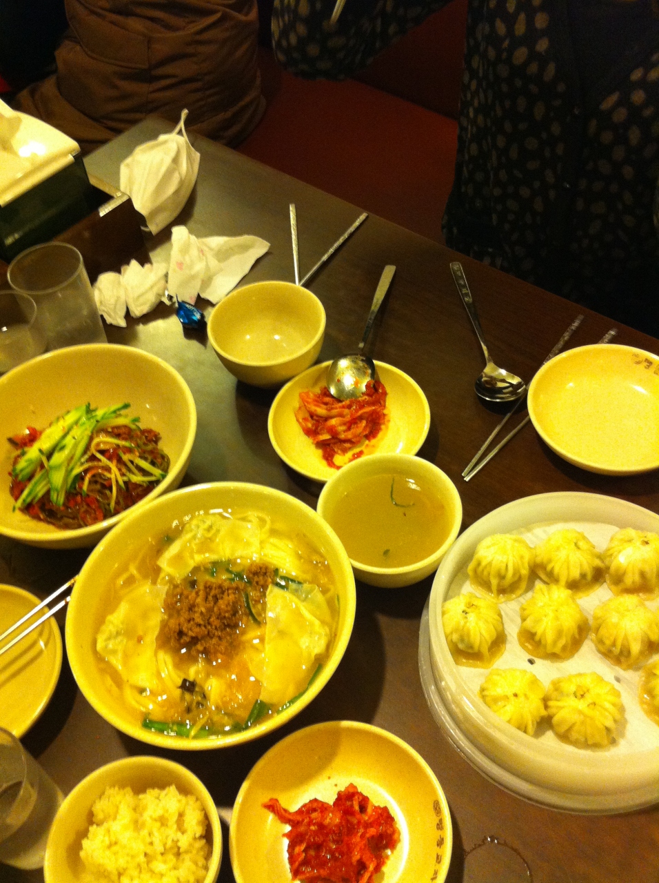 メニューは、餃子とカルクッスと冷麺の3種で値段も一緒です。キムチは浅漬けでニンニクがすごく効いてます。私は割と好きでした。