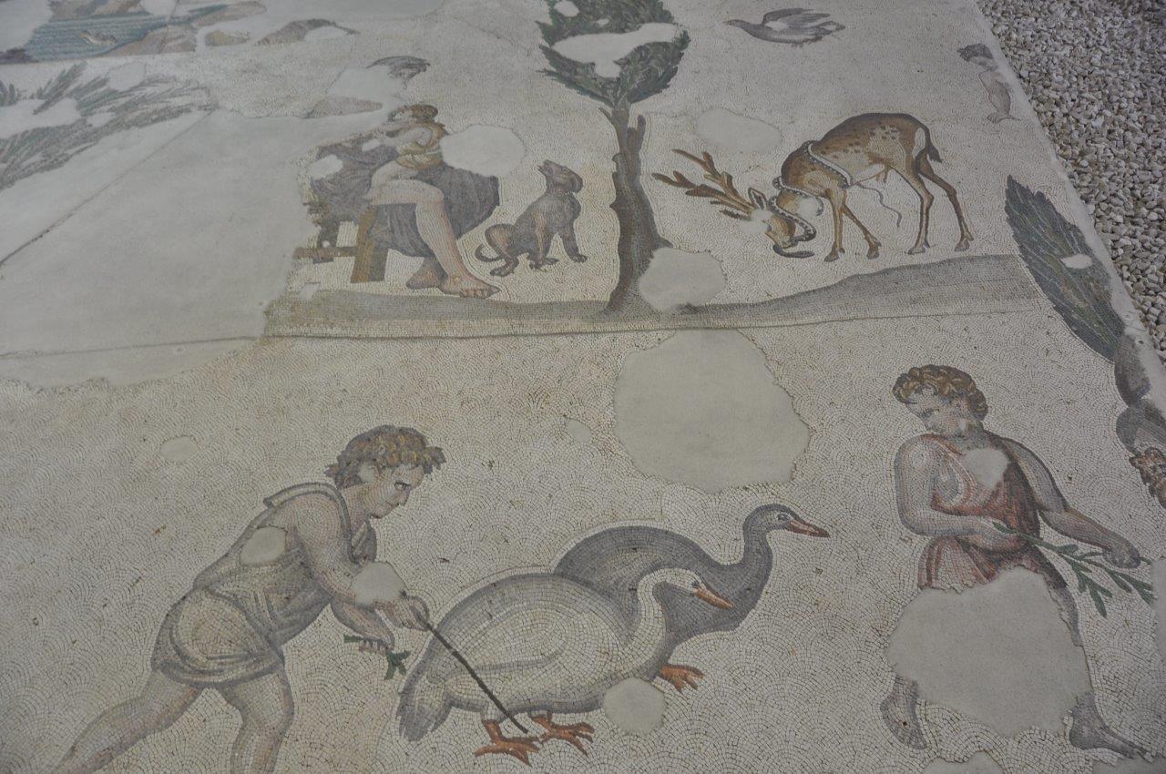ビザンツ帝国という事でアヤソフィアのような宗教的なモザイク画だと想像していたが、想像上の動物や人々の生活の様子が描かれている。