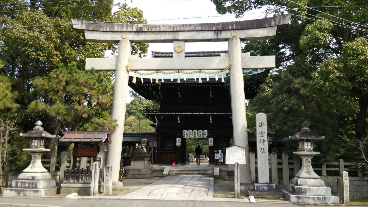 平安京遷都の際、桓武天皇の勅願で崇道天皇の霊をまつり、京都の守護神にしたのが始まりという由緒がある神社です。鳥居や本殿に歴史が感じられます。最近、話題の応仁の乱がここで起きました。楼門前に石碑がありました。