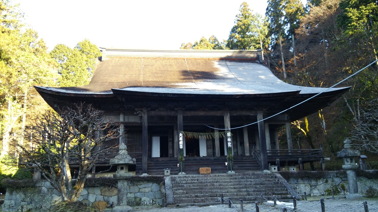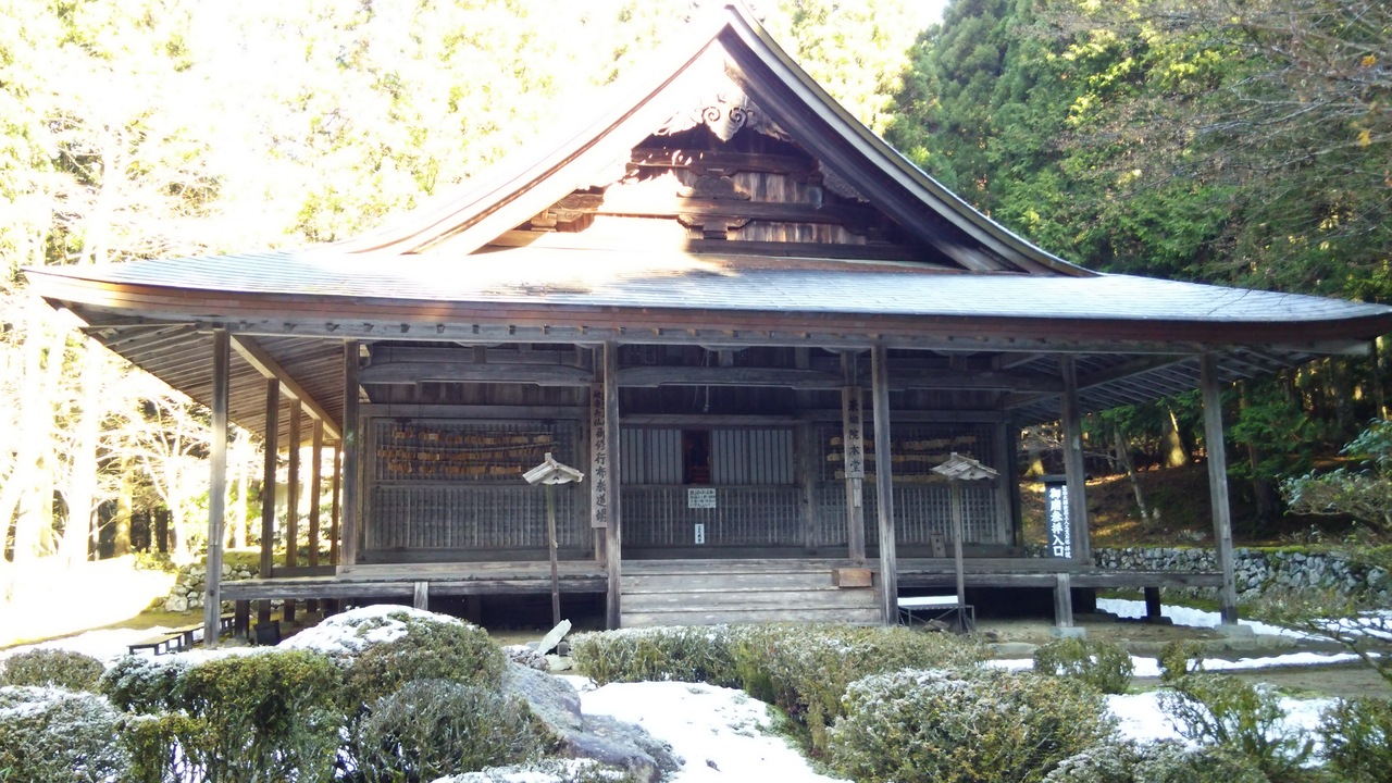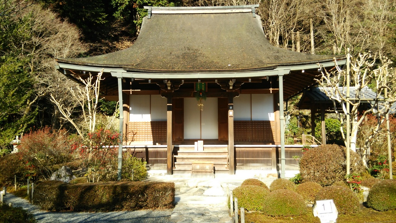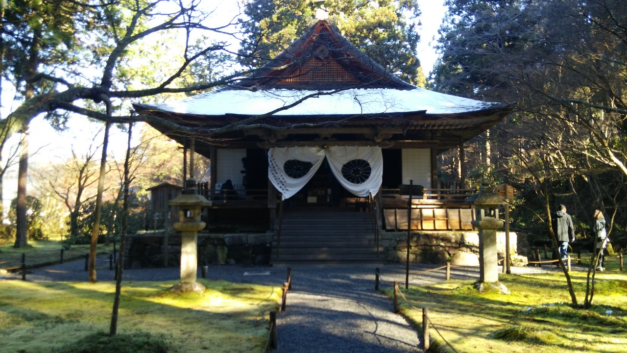 三千院から坂道をさらに10分歩くと着きました。1109年に良忍が開き、来迎院と並ぶ声明道場の中心的な寺院だったそうです。本堂には薬師如来、阿弥陀如来、釈迦如来が本尊としてまつられていました。近くには声明の稽古でつかった音無の滝がありました。
