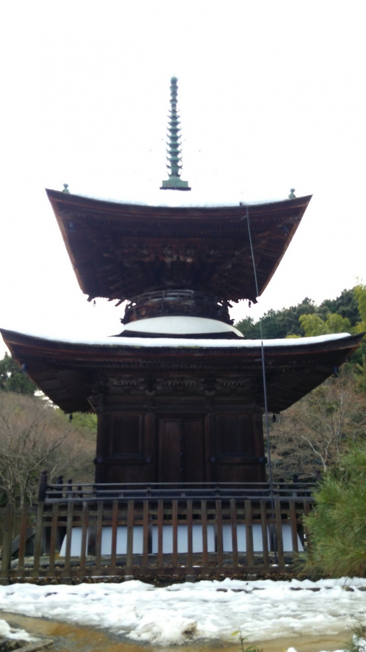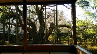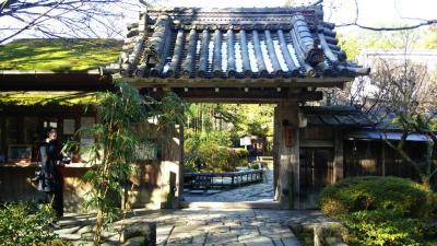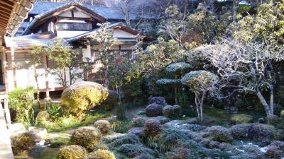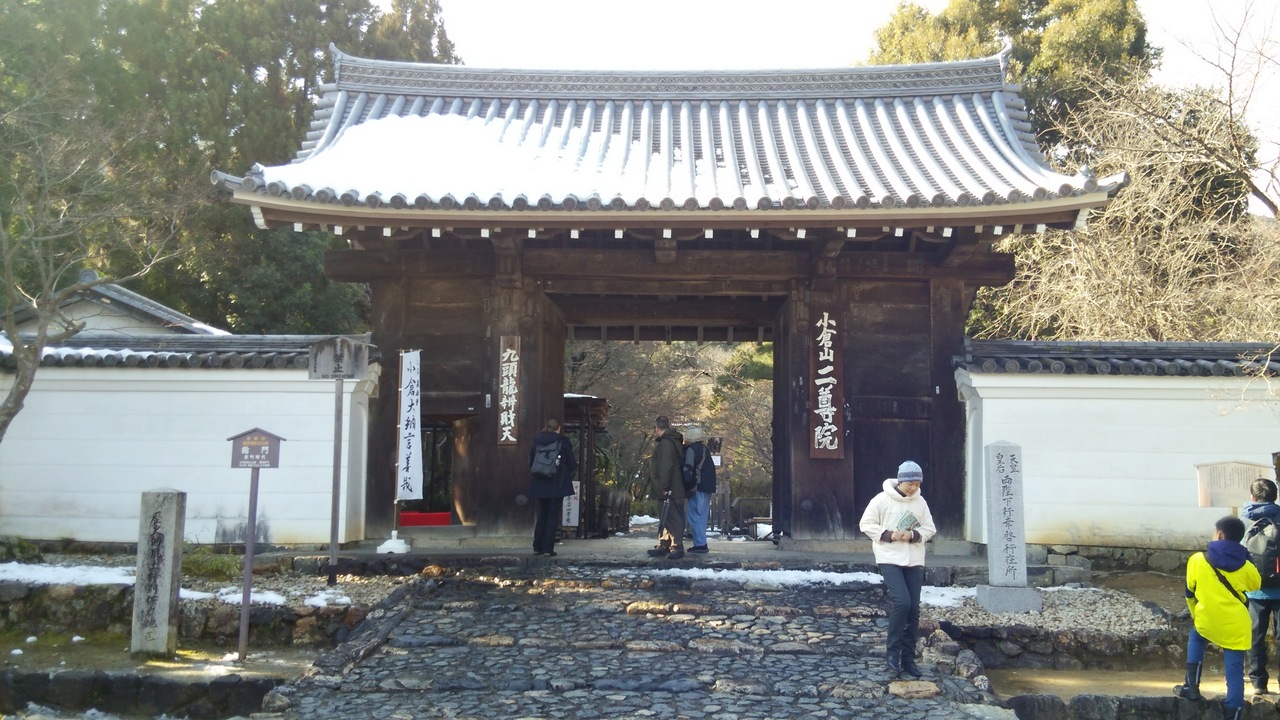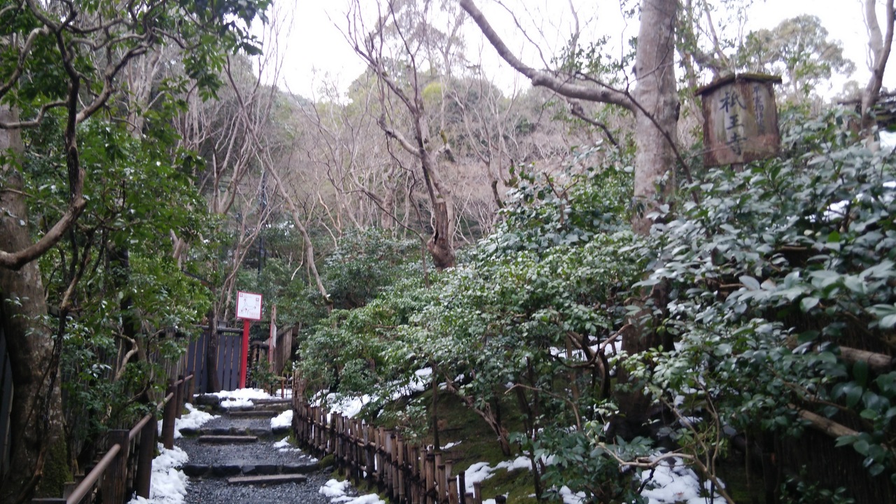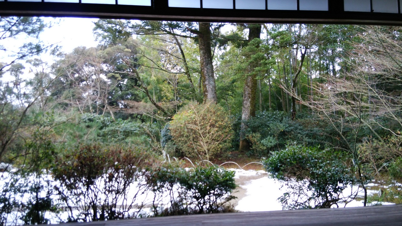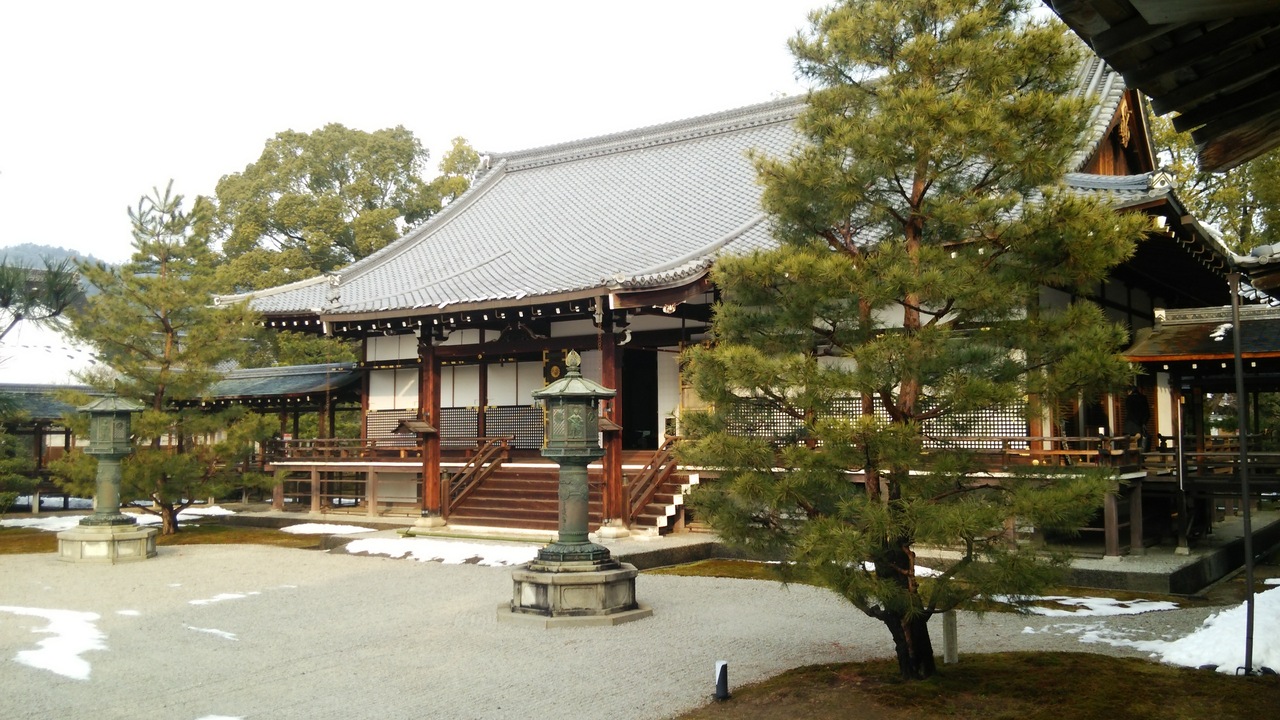 JR嵯峨嵐山駅から北に歩いていきました。敷地は広く、しん殿から廊下でつながった御影堂、五大堂と奥に建物を進んでいきました。昔の離宮だけあって、建物は歴史が感じられました。日本庭園には雪が残っていて、スリッパで廊下を歩くのは寒かったです。売店には限定の和菓子がありました。