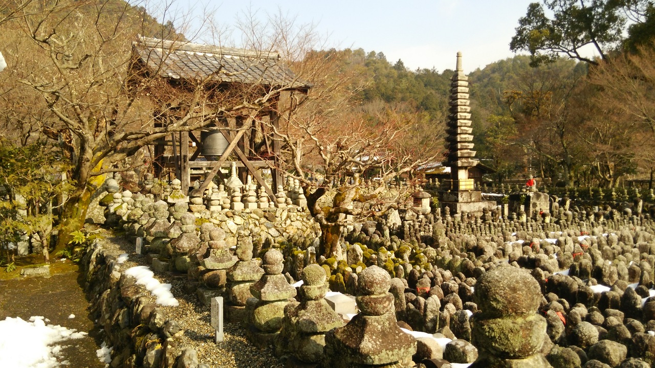 賽の河原に模した西院の河原があり、おびただしい石仏がありました。少し薄気味悪かったです。本堂奥にある竹の小径を抜けると六面体の珍しい地蔵がありました。西院の河原に戻ると、ちょうど鐘をついていて、鐘の音が石塔と石仏に大変合っていました。