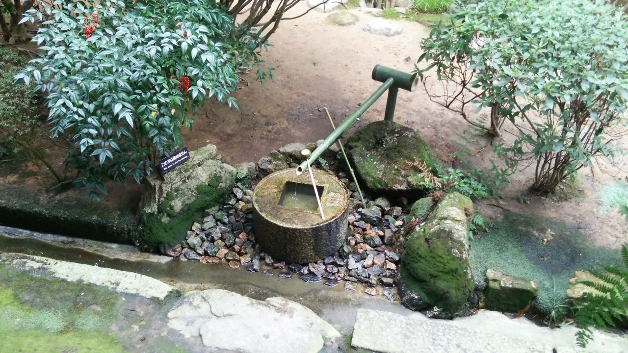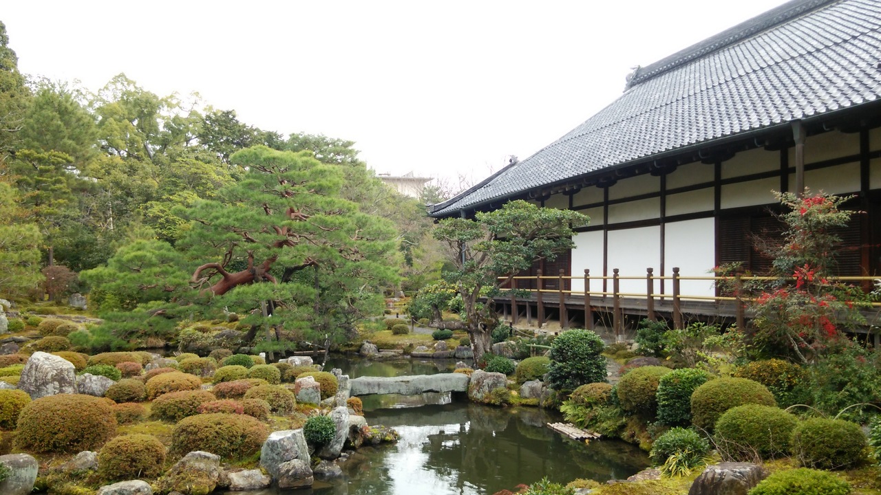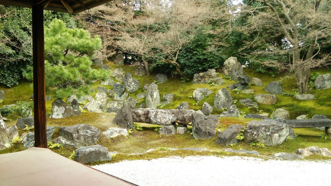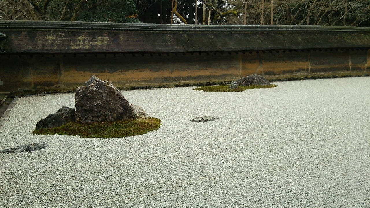 白砂と15個の石で禅の世界を表現した石庭で有名です。初めて本物を見ましたが、思ったより小さい印象です。水戸光國がおくった知足のつくばいも印象に残りました。外国人観光客に大人気でした。寺内には大きな池があり、湯豆腐の料理屋もありました。
