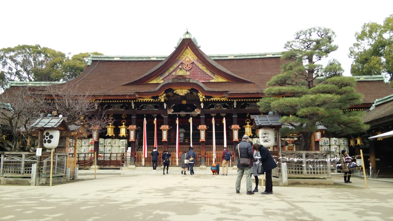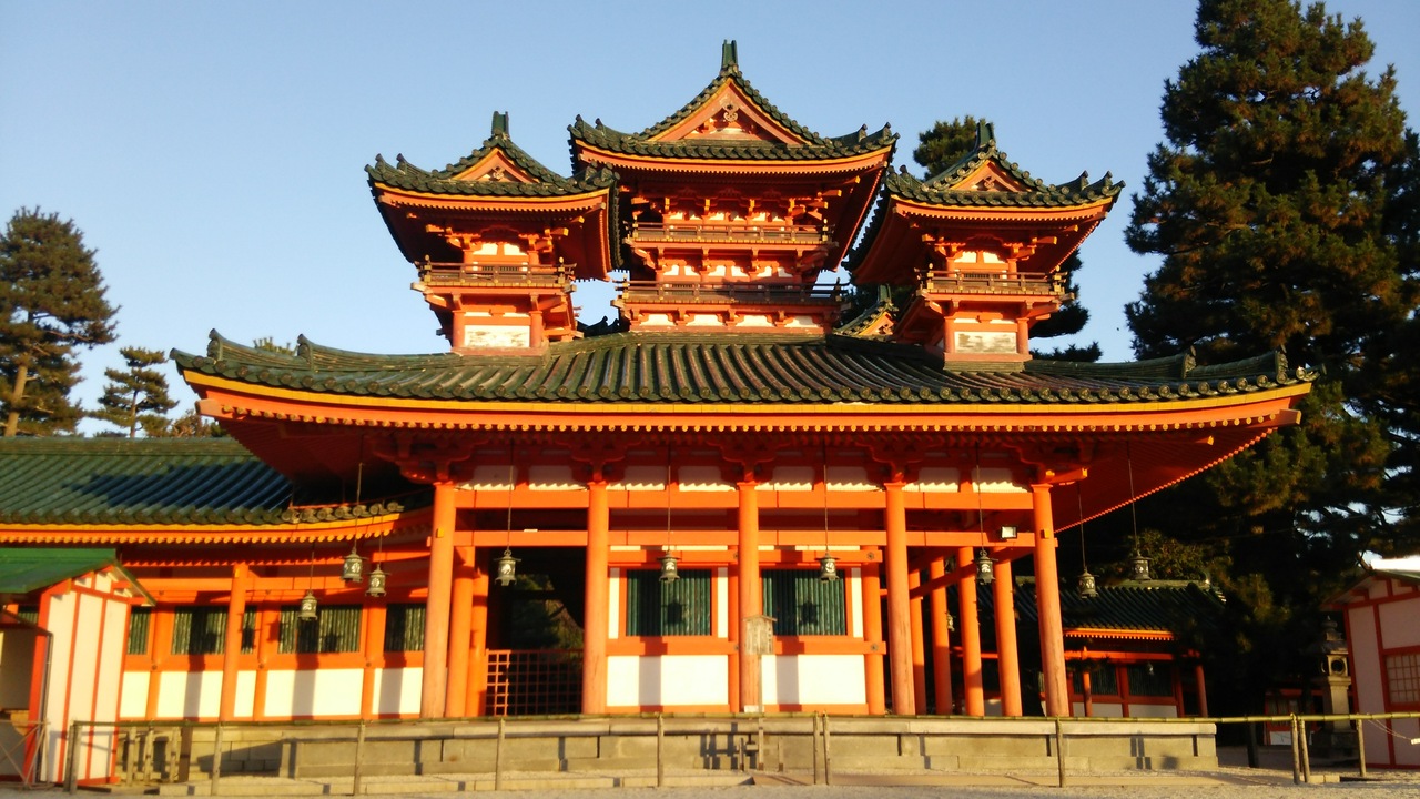 立派な朱色の鳥居が目印です。楼門も堂々としています。平安京の正庁を再現して作られたそうです。拝殿近くには右近の橘と左近の桜がありました。拝殿両脇の建物も豪華でした。御朱印は楼門を入って左側で頂くことができました。