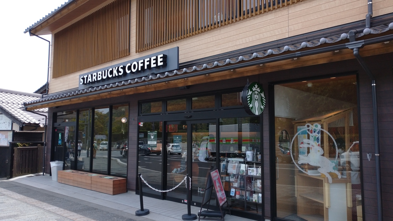 全国の観光地にご当地スターバックスコーヒーをみかけますが、出雲大社近くにもありました。お土産物屋や飲食店が立ち並ぶ参道が始まる鳥居前交差点前にありました。一階で注文、2階の席からは出雲大社が眺められる一等地にありました。