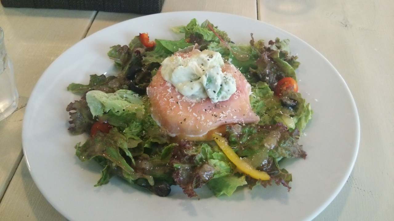 ランチで利用しましたが、パンケーキとフレンチトーストとドリンクのセットがありました。生ハムとアボカドのパンケーキにしましたが、たっぷり野菜が載っていて、ドレッシングもほどよくかかっていて、思ったよりボリュームがありました。