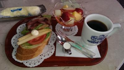神戸の楽しみの一つは、にしむら珈琲のモーニング。今回はホテルから歩いてハーバーランド店に行きました。ベーコンとアスパラガスのバゲット、フルーツカクテル、コーヒーがついたモーニングをチョイス。香ばしい珈琲と、バゲットがよく合います。ハーバーランド店は運河沿いの店に来たようなつくりで、ただ、座って珈琲を飲むだけで幸せな気分になれます
