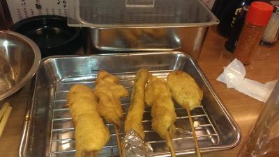 串かつが食べたくて、梅田あたりで手軽な店構えなので行きました。カウンター席だけなので一人でも平気です。一本120から200円ぐらいなので腹具合に合わせて注文できます。おどんも有名なようです。ソースは2度漬け禁止です