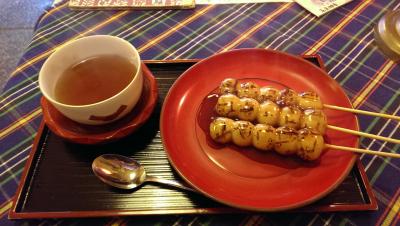 鈴虫寺にお参りに行ったあと、小腹がすいていたので立ち寄りました。みたらし団子を注文すると、焼きたてが運ばれてきました。甘辛い団子は、ほうじ茶によく合います。店の方が親切でいろいろ教えてくださいました。イーガールズも来たことがあるそうです