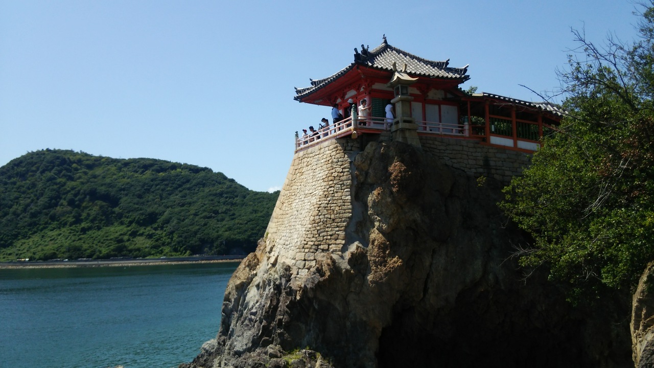 沼隈半島の南端、断崖にたつ珍しい寺でした。拝観券を購入し、御朱印帳を預け、敷地内に入りました。なかは狭くて本堂がなかなかスマホに収まりません。かつて切手の図案になった観音堂には子授け観音がいらっしゃいました。階段がかなり傾いていました。