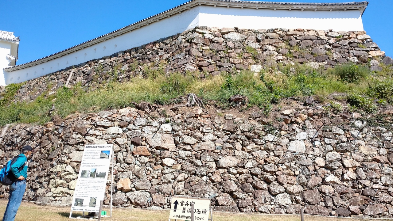 限定御城印が目当てで朝から再訪しました。秋晴れの連休中ということで観光客や家族連れで行列ができていました。開館1時間後でしたが、天守の見学まで2時間ぐらいかかるといわれました。天守は諦め、帰る途中に官兵衛ゆかりの石垣を発見しました。無料で見られるのでおすすめです。