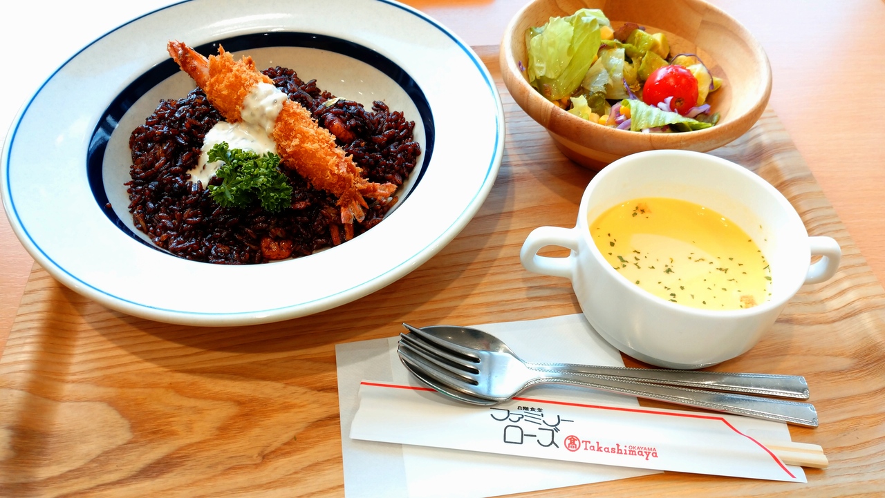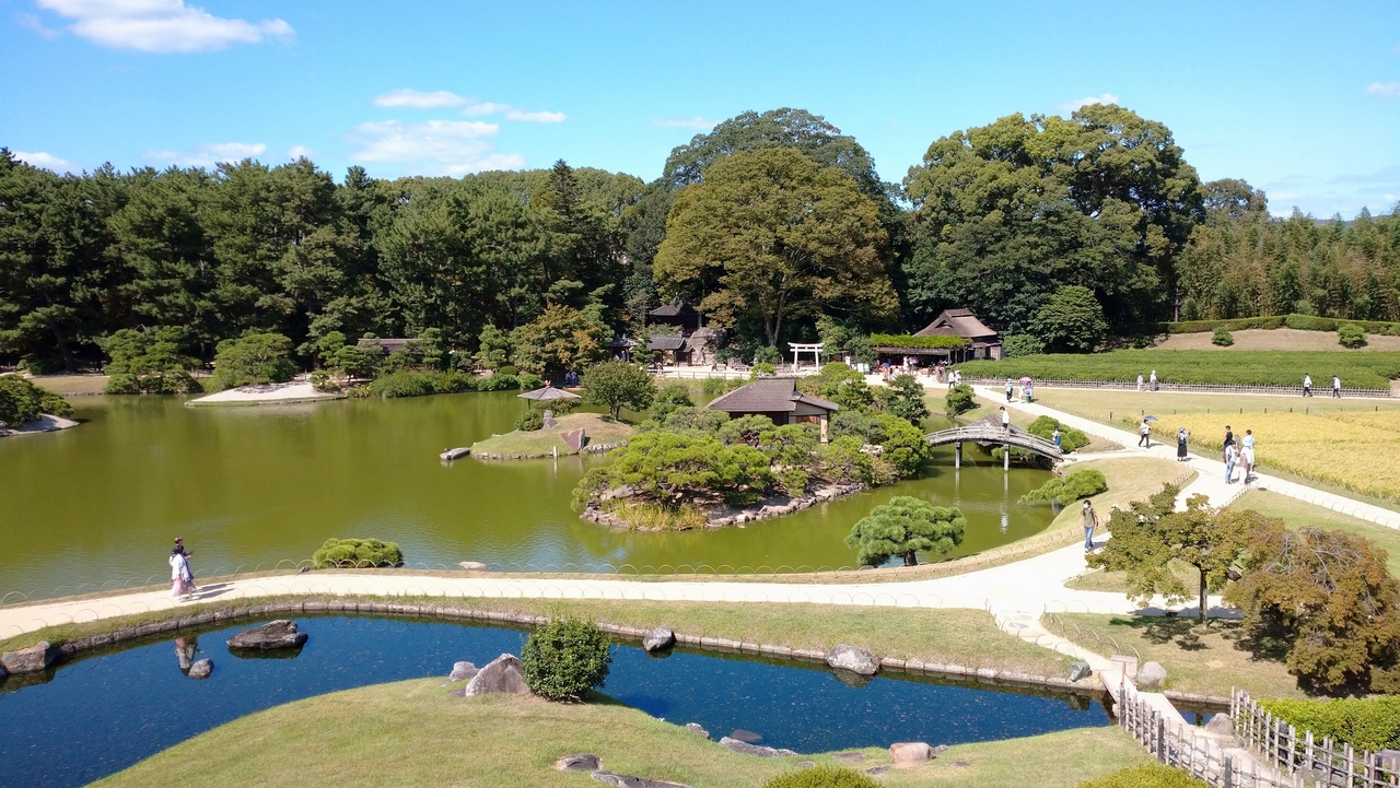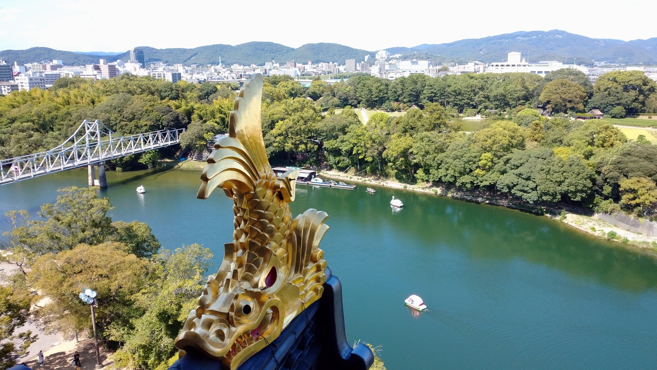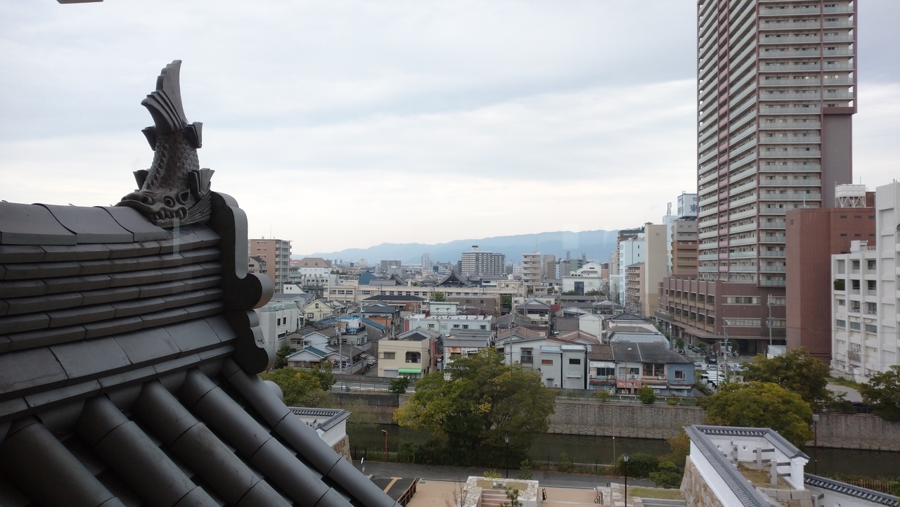 御城印が目当てで再訪しました。路面電車の駅から徒歩で進むと黒い天守が現れました。雰囲気のある門をくぐり、天守に入りました。エレベーターで最上階へ。市内が一望でき、後楽園がきれいに見えました。地元で有名なのでデニムを使った御城印帳も購入しました。