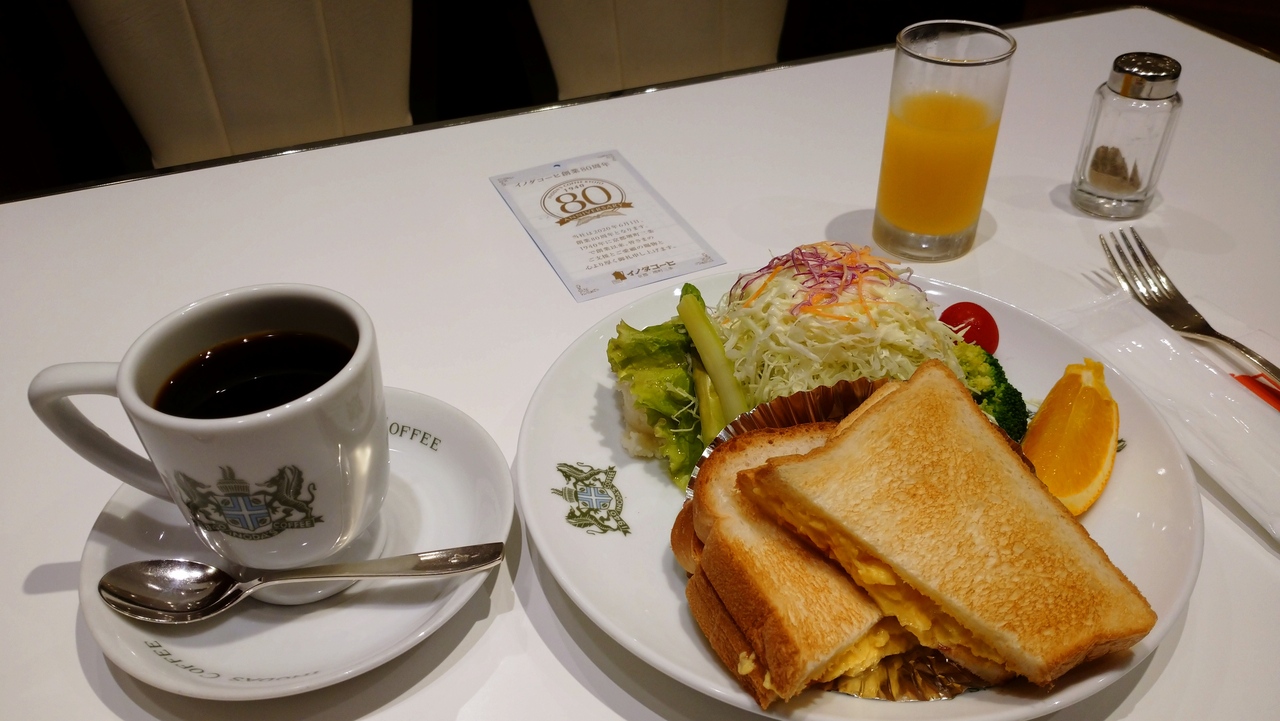 大河ドラマ麒麟がくるのゆかりの城巡りの一環として京都に来ました。京都でコーヒーといえばイノダコーヒです。ポルタ支店でモーニングセットを注文しました。サラダとサンドイッチ、ホットコーヒーのバランスがよく満足しました。