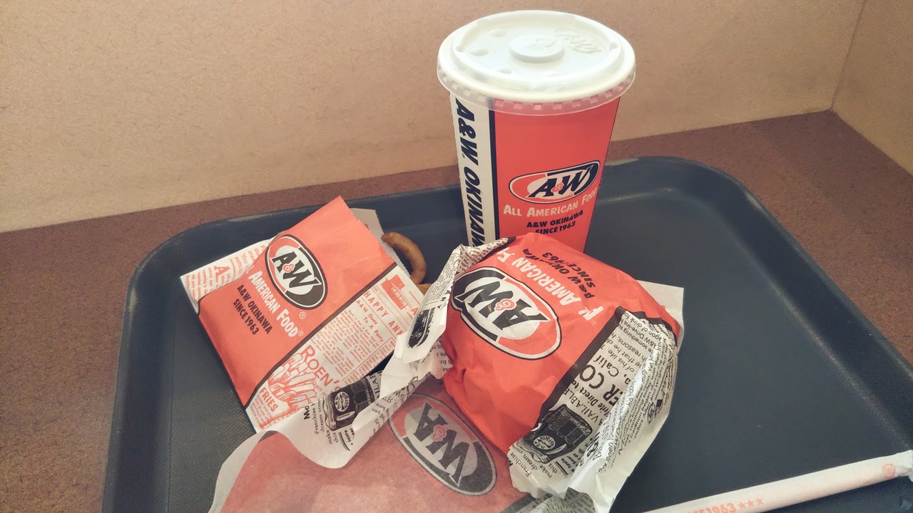沖縄のタコスの元祖と言うことで本店に初めて行きました。共用の駐車場に停めました。ツナ、チキン、ビーフの3種類のタコス、さんぴん茶、オニオンリングを頼み、1050円でした。島唐辛子をつかった特製のソースをかけて食べました。いままで食べたタコスで一番美味しかったです。