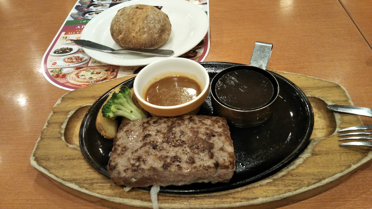 近江八幡駅の近くに宿泊したので近くで手軽に夕飯を済ませようと利用しました。夕方の6時過ぎでしたがほぼ満員でした。炭みたいな焼いた固形燃料に焼き付けるハンバーグの石窯パンセットにしました。ジュージューさせて食べると美味しさが増す気がしました