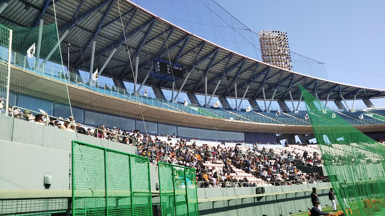 サンマリンスタジアム宮崎で巨人のキャンプをやっていました。平日でしたが、駐車場にもたくさんの車が停まっていました。天気もよく、気候も暖かく、スタンドにもたくさんの野球ファンが駆けつけていました。キャンプを見るのに最適でした