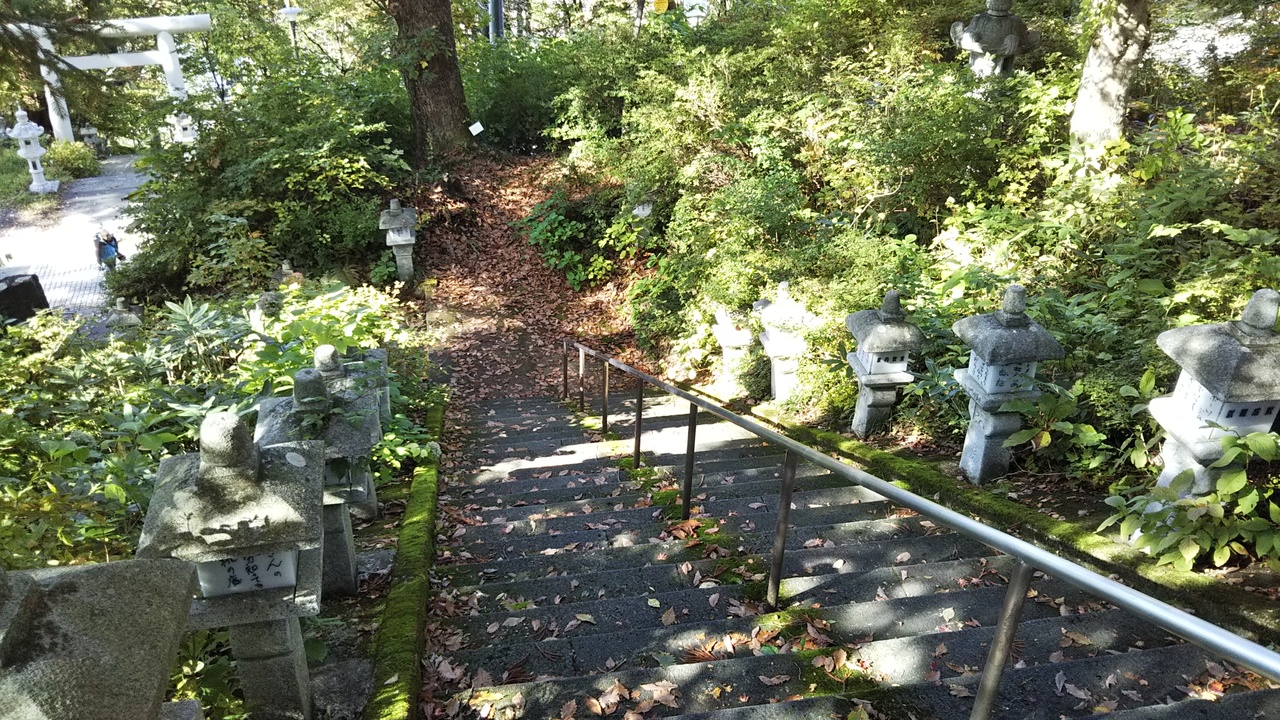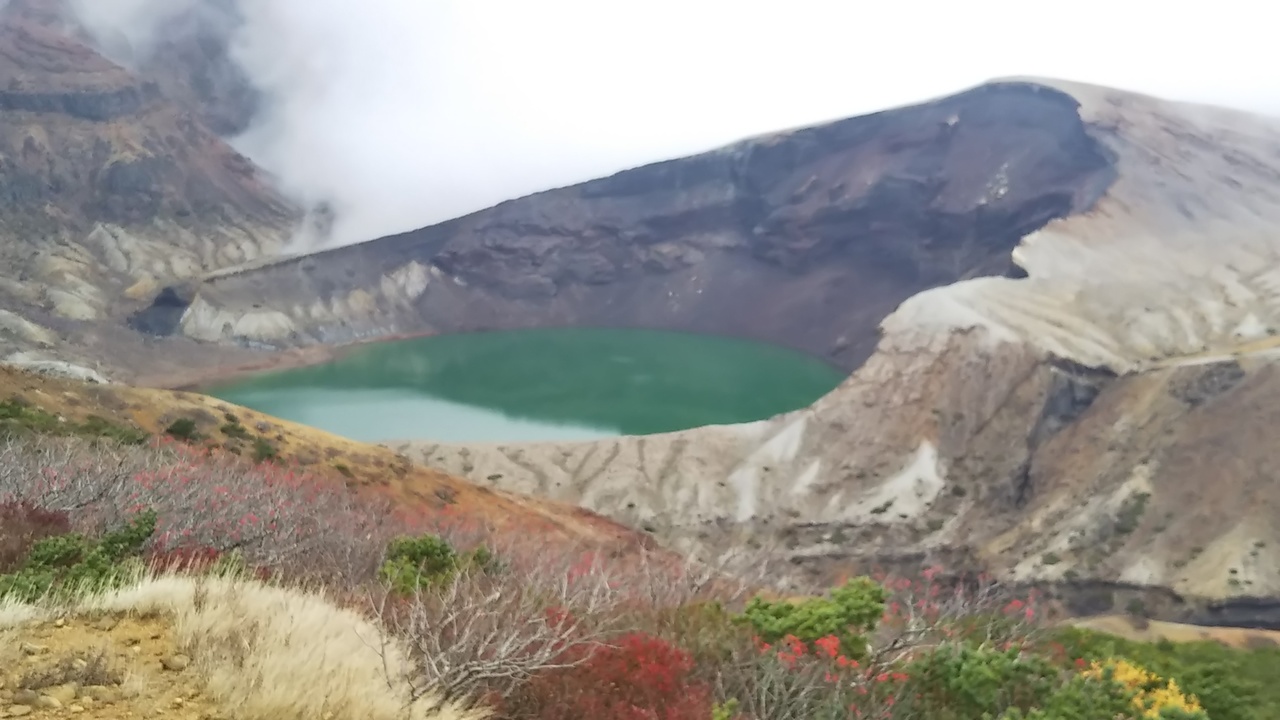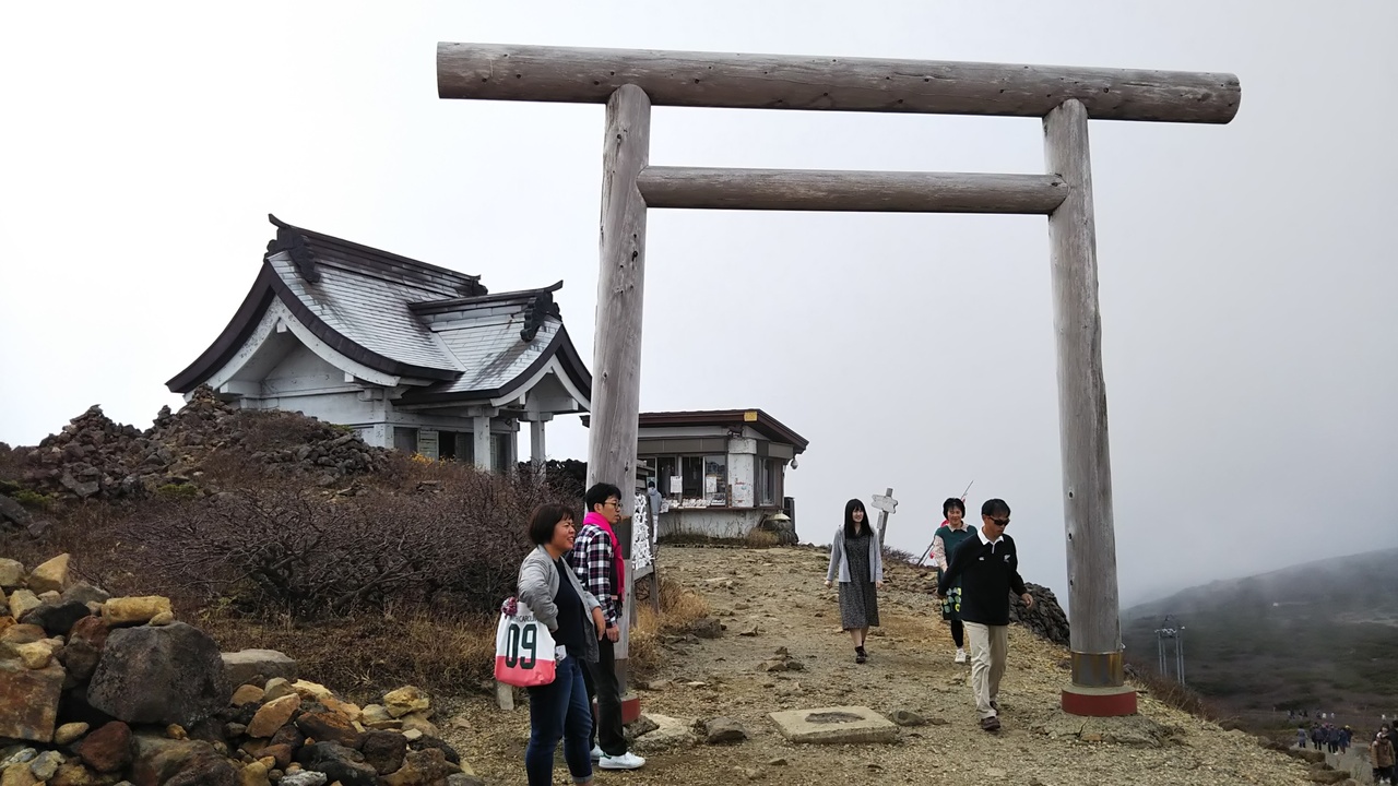 お釜からややきつい坂道を上ると、立派な神社がありました。奥社でした。境内はお釜がきれいに撮れる撮影スポットになっていました。御朱印をいただくことができました。夏山と冬山の二種類のオリジナルの御朱印帳がありました。