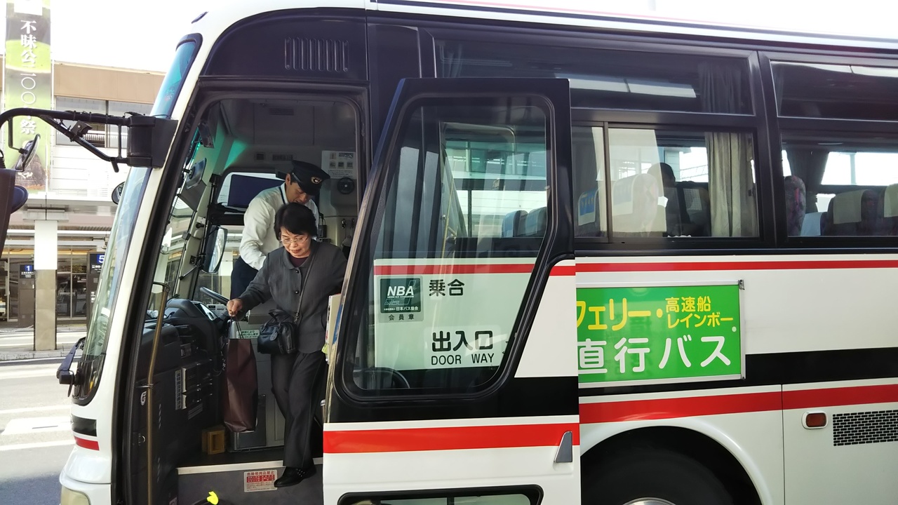 高速船レインボーで七類港に着くと、松江駅行きと、米子空港経由米子駅行きのバスが待っていました。松江駅までは約40分でした。途中のバス停はレインボープラザだけでした。運賃は松江駅まで1000円でした。交通系ICカードは使えません。
