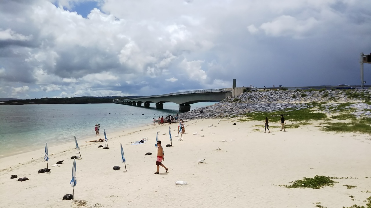 美ら海水族館の後に車で立ち寄りました。古宇利島と沖縄本島をつなぐ古宇利大橋は本島から下るときに、背景に島があり、すばらしい光景でした。ビーチを歩きましたが、日差しが強かったですが、海がきれいで、風が気持ちよかったです。