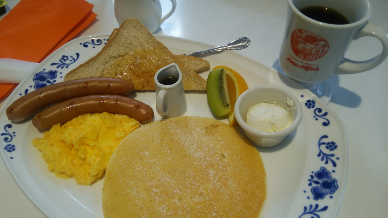高輪に宿泊したので、アンナミラーズに初めて行きました。店内はアメリカン、店員さんの制服がかわいかった。朝食はトーストとパンケーキがセットになっていて、卵や付け合わせを選べてお得でした。ホットコーヒーがおかわりできるのもよかった。