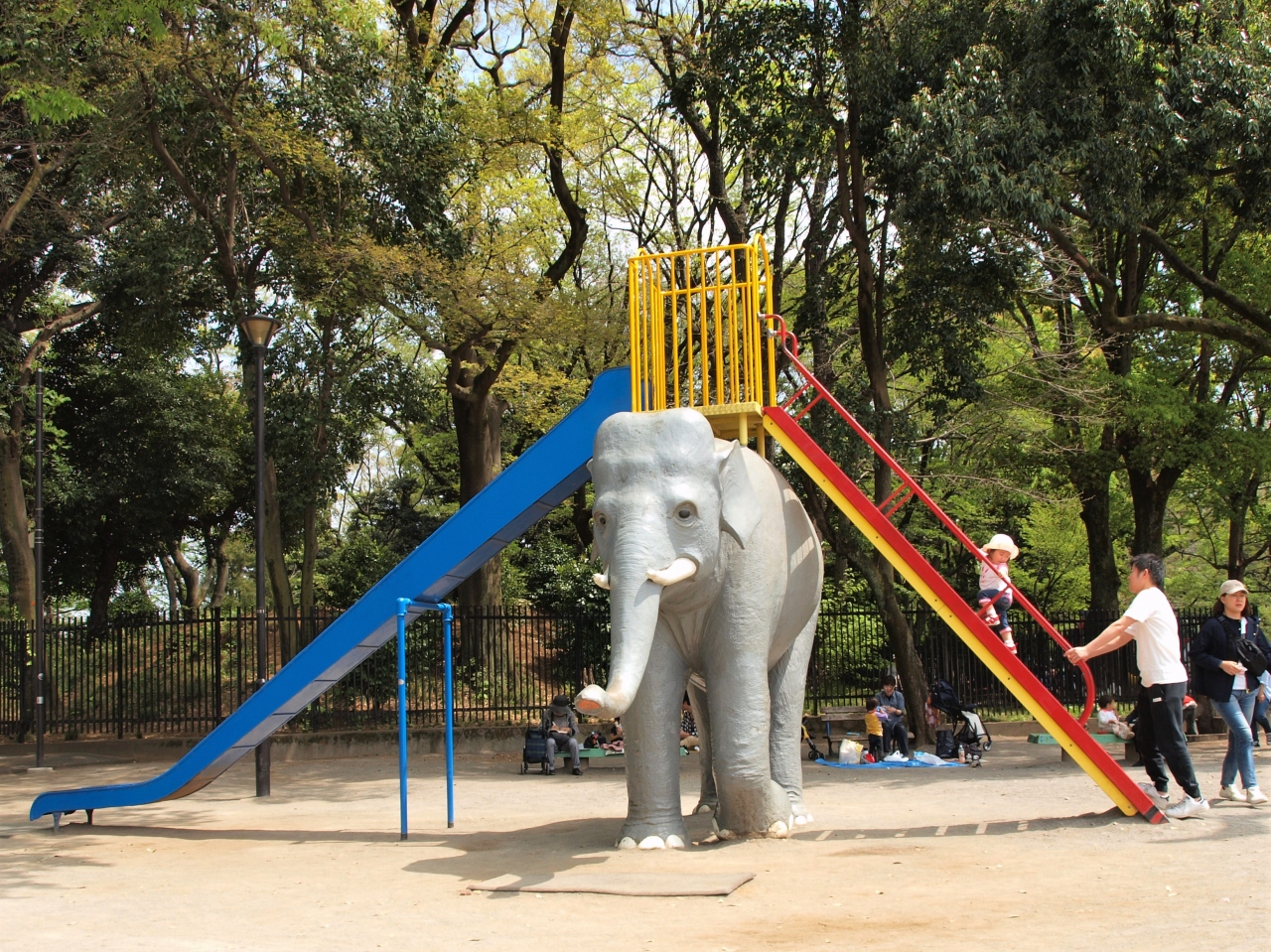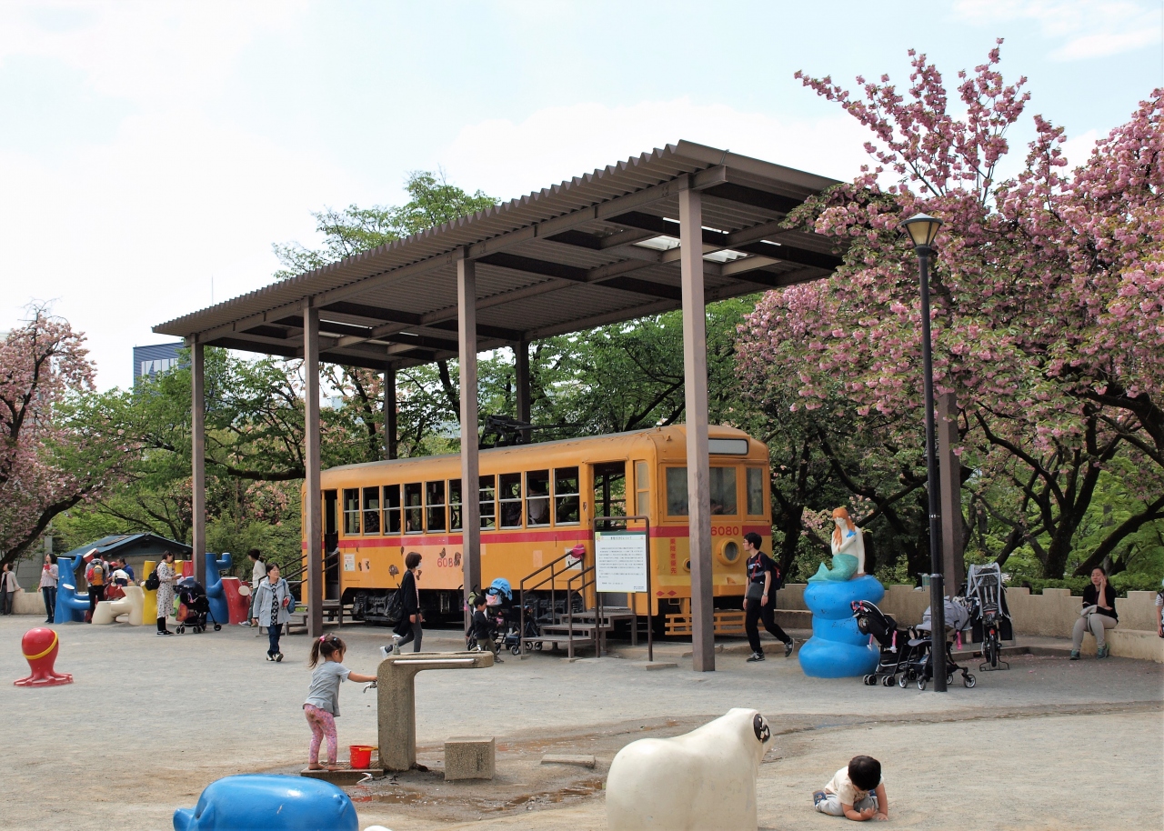 静態保存のD51や都電があったり、お砂場や遊具がある中央エリアを囲むように八重桜が咲いていて、家族連れやグループがお座敷を広げていました。