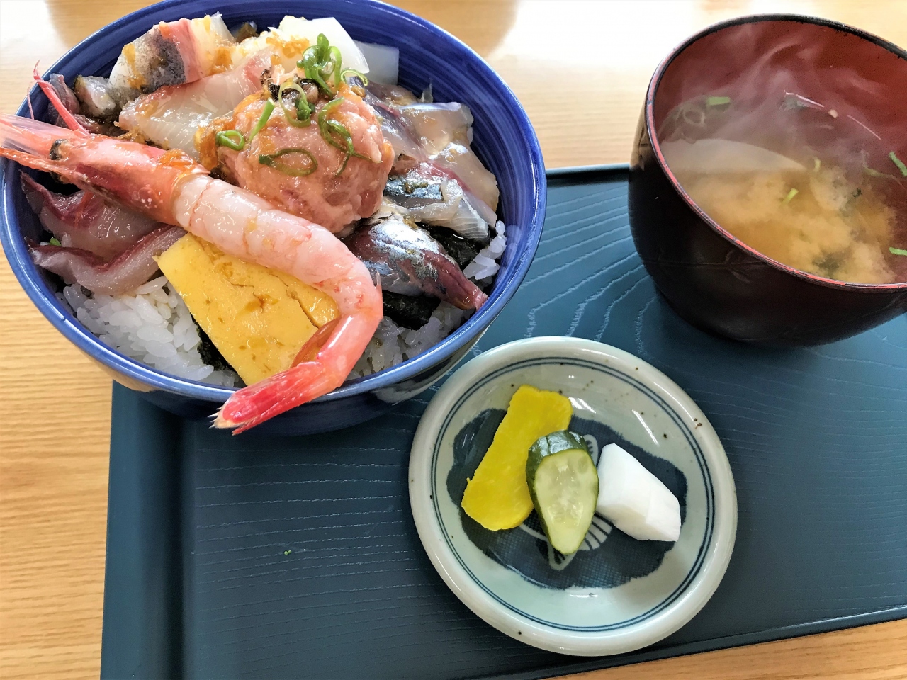 どれも美味しそうですが、迷った時は「おまかせ丼」。1700円で小振りの丼ぶりに、いろいろなお刺身が山盛りでした♪特製のたれがかかっているので、そのまま戴きます。