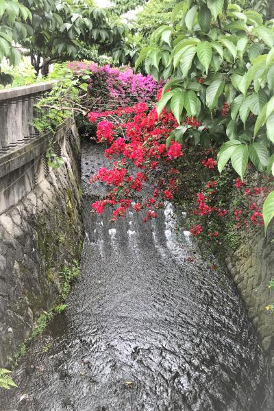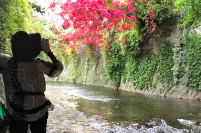 熱海駅では大勢の人が行き来して、コインロッカーの空きがないほどに混んでいましたが、ここ糸川のブーゲンビリアを見に来る人はチラホラ。おかげさまで上から眺めたり、川の畔まで降りたりしながら、ゆっくりと鑑賞することが出来ました。