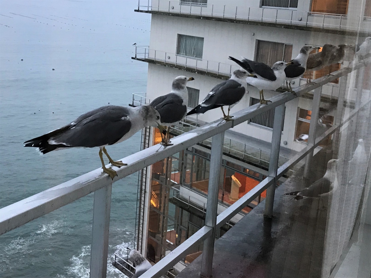 客室では、窓辺の手すりにかもめがたくさん遊びに来て、とても可愛いです。