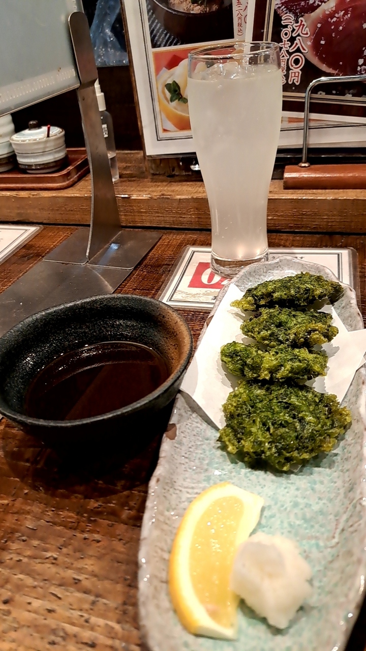 「これやき定食」(1,280円)が”塩たたき”と”タレたたき”の両方がついてておススメだとかで注文。加えて「青さのり天ぷら」(600円)と「大人ゆずチューハイ」(400円)も注文。