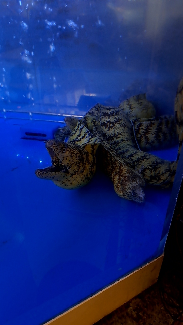 賑やかな入口を入ると、大きな生け簀があり、狂暴そうなウツボがいました、、、