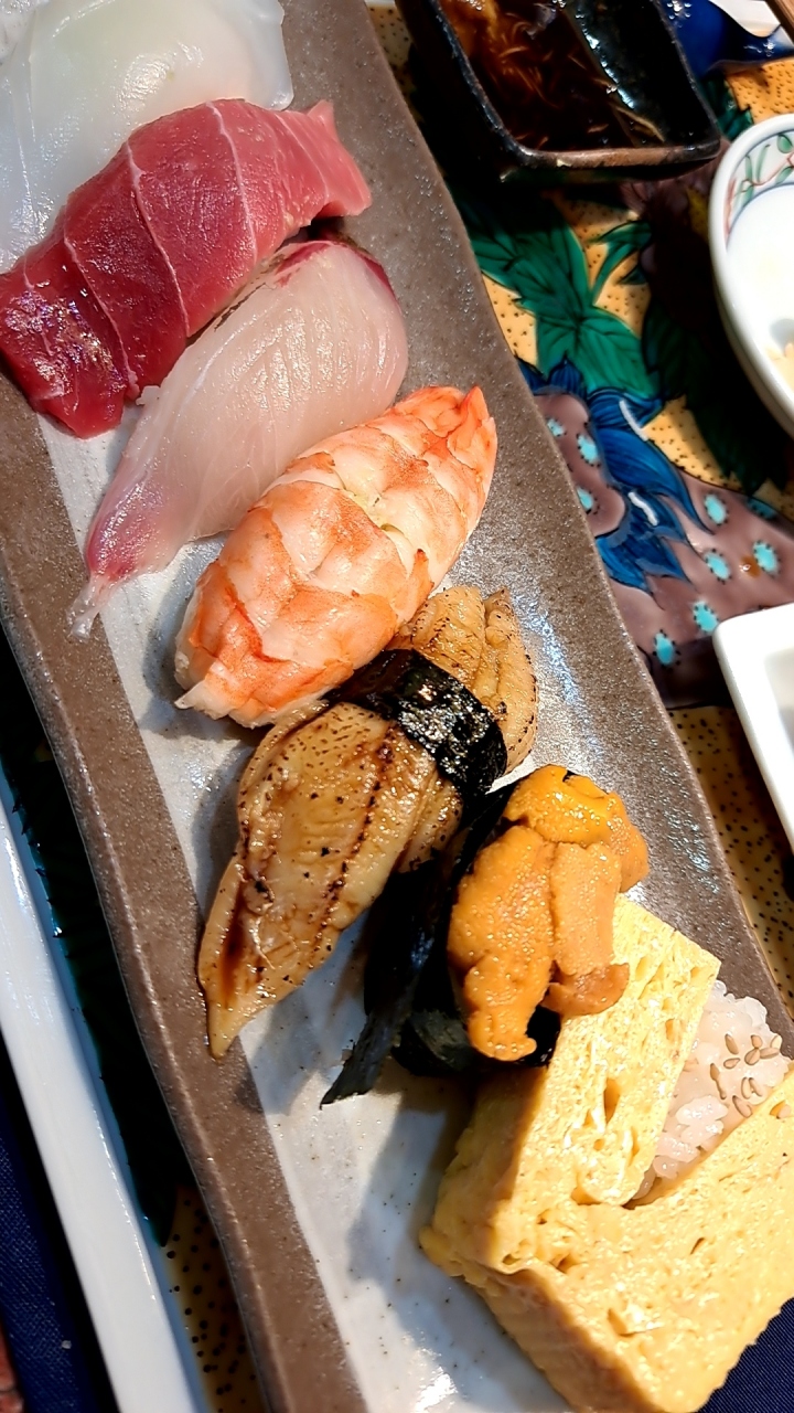 ■鮨(七貫/中トロ、白身魚、立イカ、アナゴ、うに、海老、玉子)