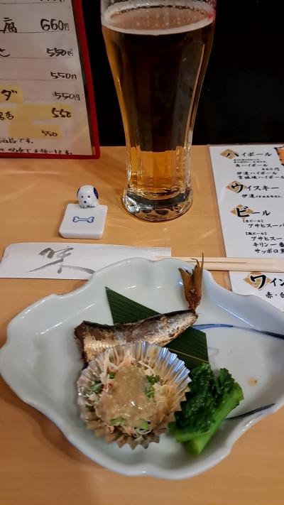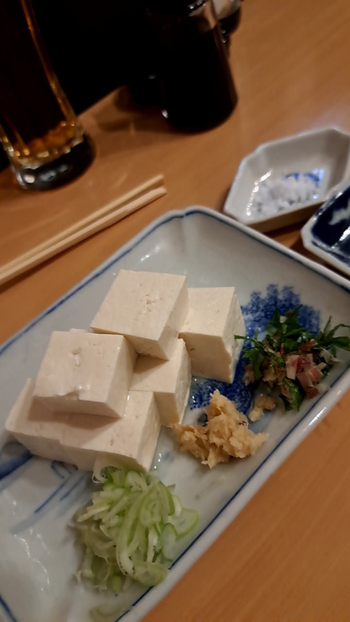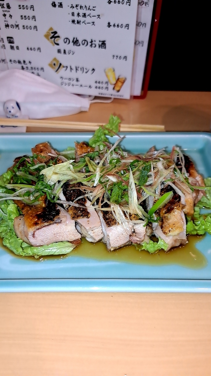 地鶏もも焼きと冷奴を注文。親方さんから店内のお客に振舞い酒もあり、サービス満点。