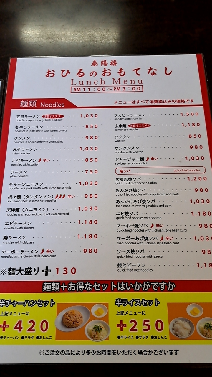 メニューを見ると、「マーボー焼きそば」(980円)には、とんがらしマークがついて”辛い”と書かれてましたが、店員のおばさんに一応確認すると「そんなに辛くないよ!」とのことなので、注文する。