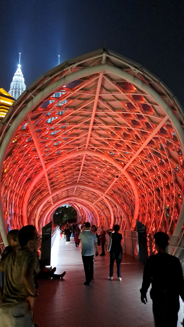 道路と川をまたぐ歩道橋ですが、歩道橋自体のイルミネーションが色々変化し、またペトロナスツインタワーもとても美しく眺めることができます。