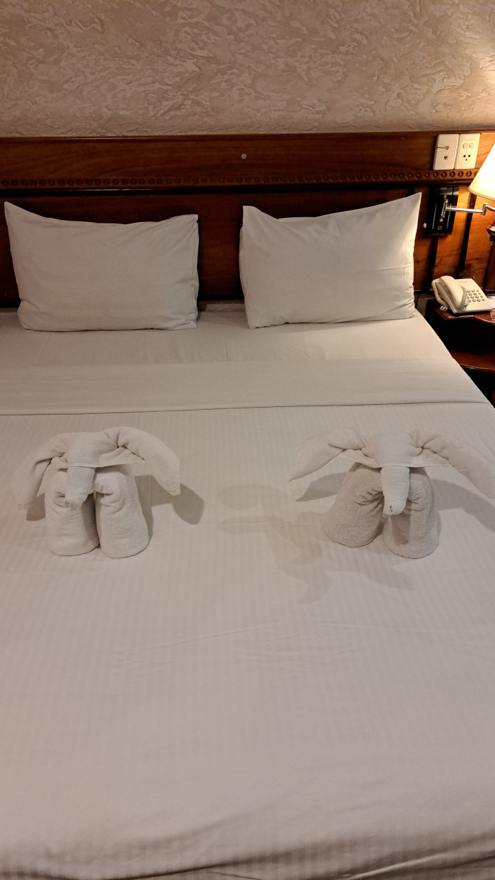 部屋はちょっと古びた感ありますが、必要十分な広さです。窓はありません。外が騒がしいので、かえってその方が良い。また、耳栓も用意されてました。