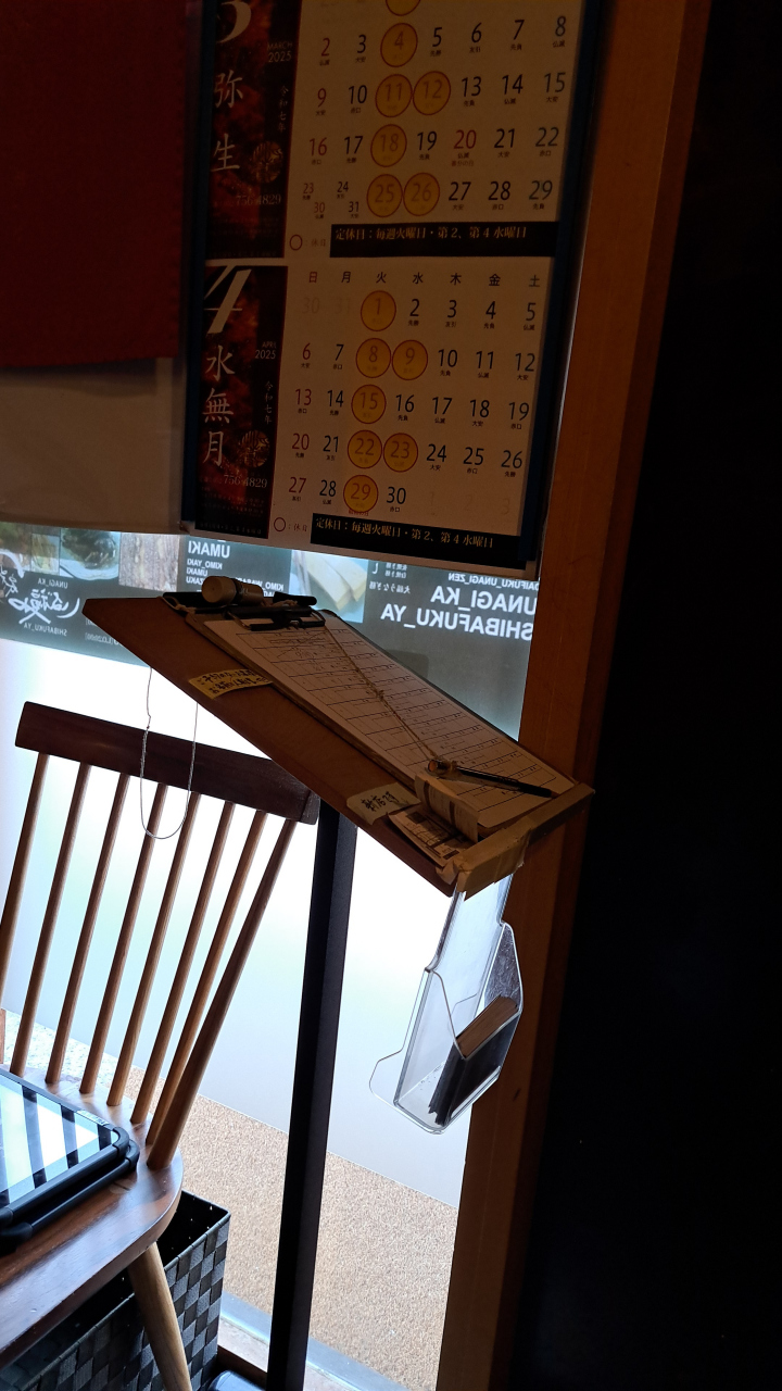 祝日の午前11時20分の開店前に到着。予約してない場合は、店内の受付で記名。店内の待ち合い席でメニュー見ながら待つ。