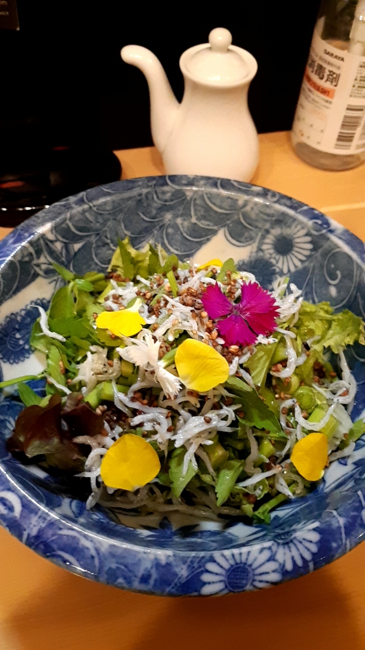 お店に入ると、カウンター席に案内された。店内は予約客ばかりでほぼ満席でした。1週間前に電話予約していて良かったです。