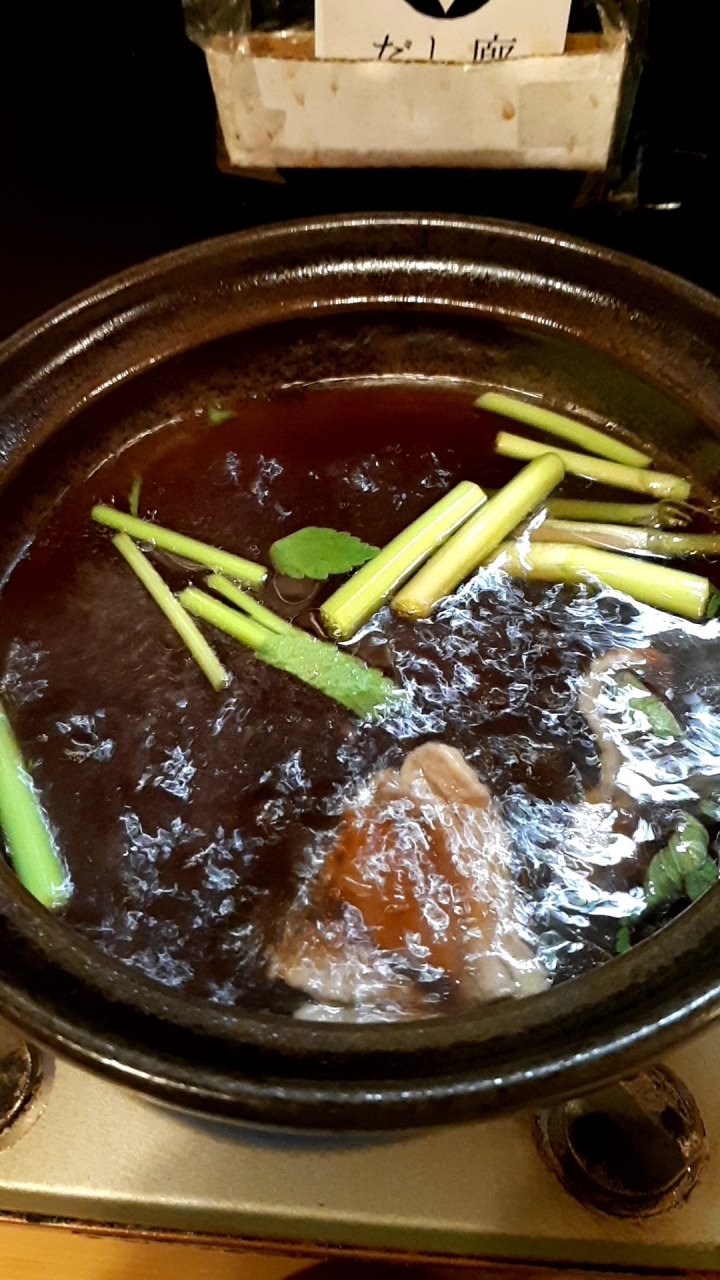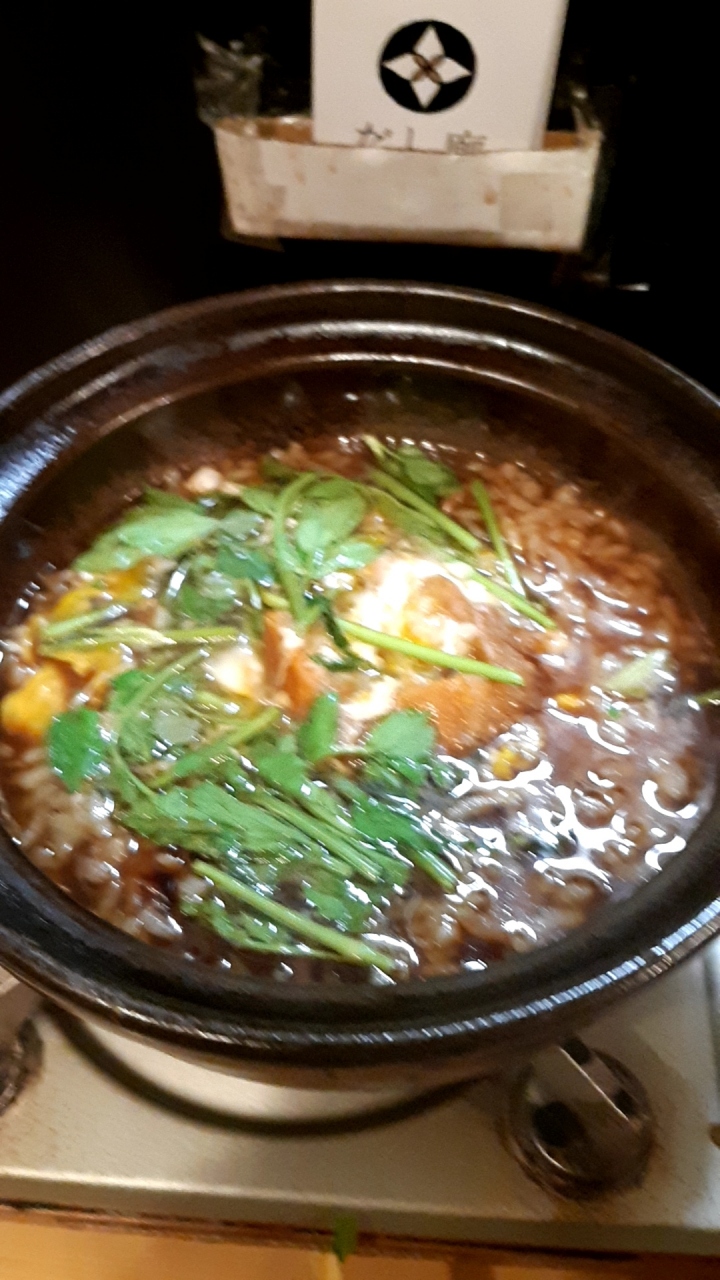 シーズン的にはせり鍋は終わりごろなんで、根っこは固くて出せないらしく、茎と葉っぱだけでした。甘辛い出汁でしゃぶしゃぶします。〆はいろいろ選べますが、無難に雑炊を選択。とても美味しくて満足できました。