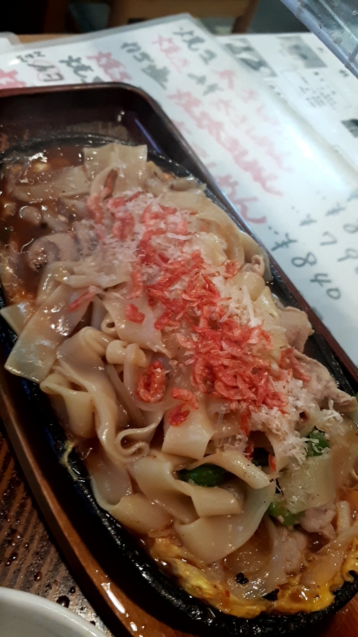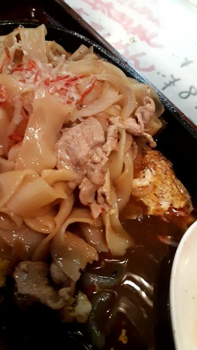 「焼き太きしめん」は普通の「きしめん」とは全く違いました。普通のきしめんの1.5倍の太いきしめんを使って、汁多めの焼きうどんって感じ。