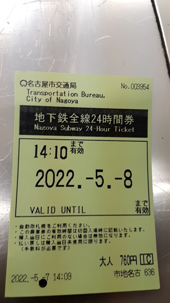 名古屋観光で、地下鉄を使う場合は、是非24時間切符を購入することをおススメします。24時間なので、初日に昼過ぎに購入すれば、翌日の午前中も観光に利用できます。