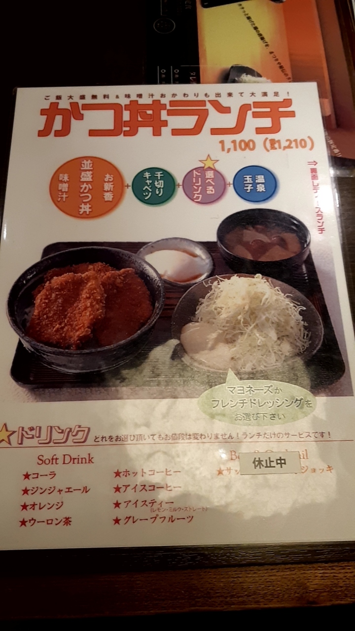 店員さんに相談して、「かつ丼ランチ」を注文。ご飯は無料で大盛にしてくれました。また、味噌汁はお代わり自由なんで、お代わりしました。