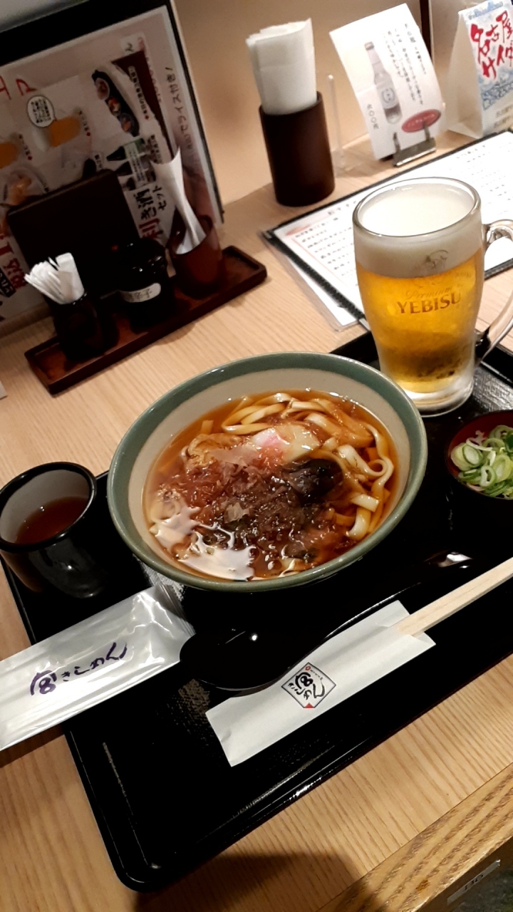 宮きしめんと生ビールで税込1,470円でした。きしめんはお上品な味で美味しかった。味とお値段はA級ですね。