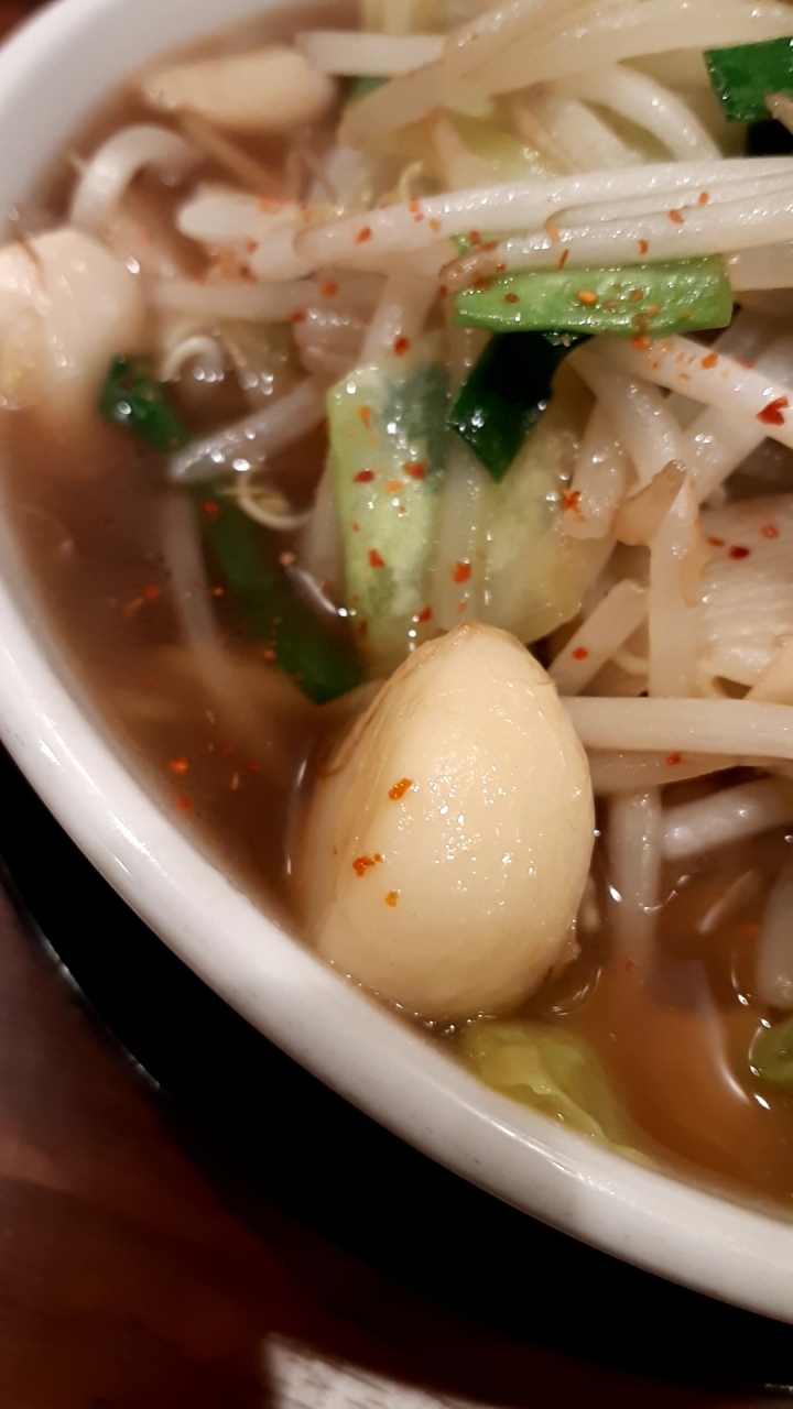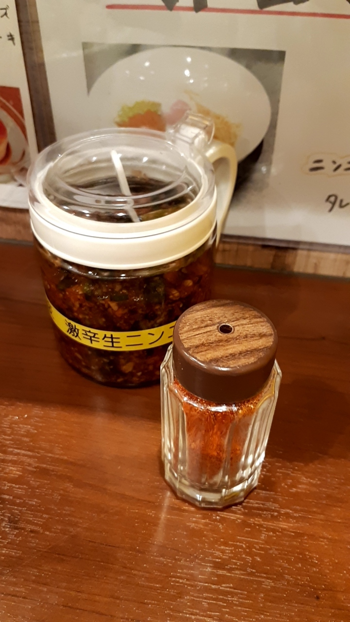 仕方なく唐辛子ゼロで注文して、テーブルにある「激辛生ニンニク」と「一味」で自分なりに辛さを調整して食べました。