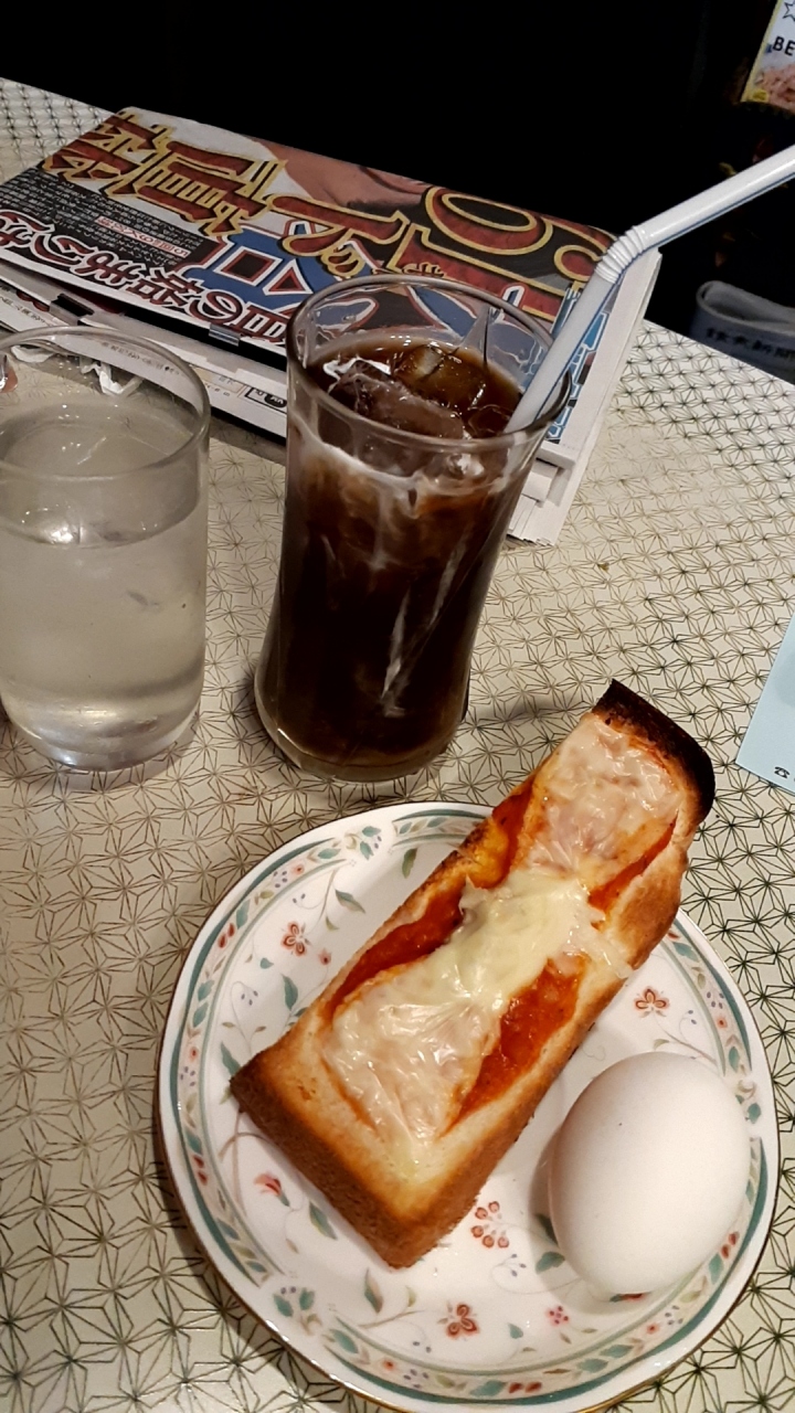 仕方なくこちらのお店に入りました。アイスコーヒーにピザトースト・ゆで卵のモーニングを注文。税込470円で、ワンコインでお釣りがでます、、、