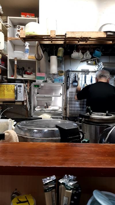 店の外観や、外から見える店内の様子を見ると、、、店に入るには少し勇気が必要です。店内は異常に狭くてL字のカウンターのみ。狭い調理場では店主のオジサン一人で切盛りしてます。