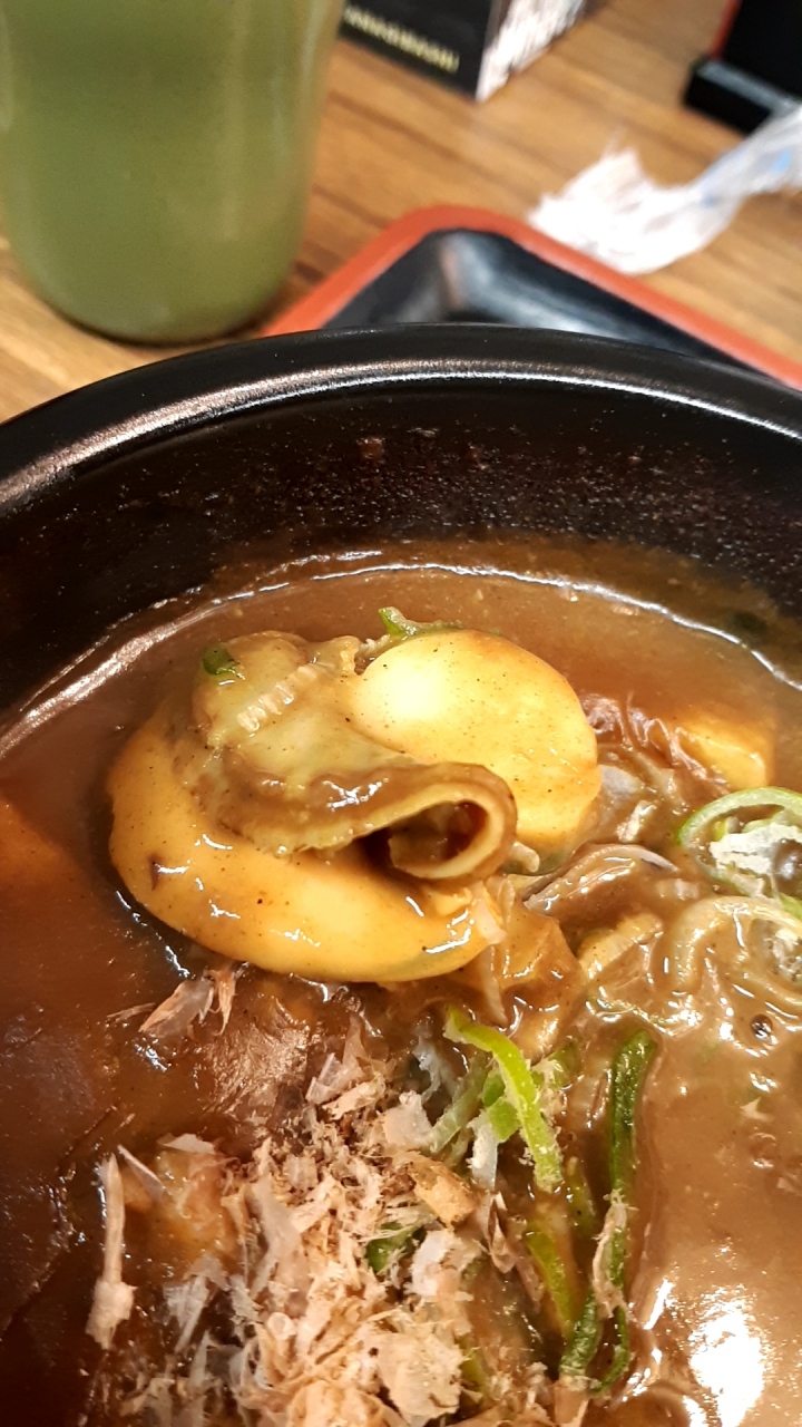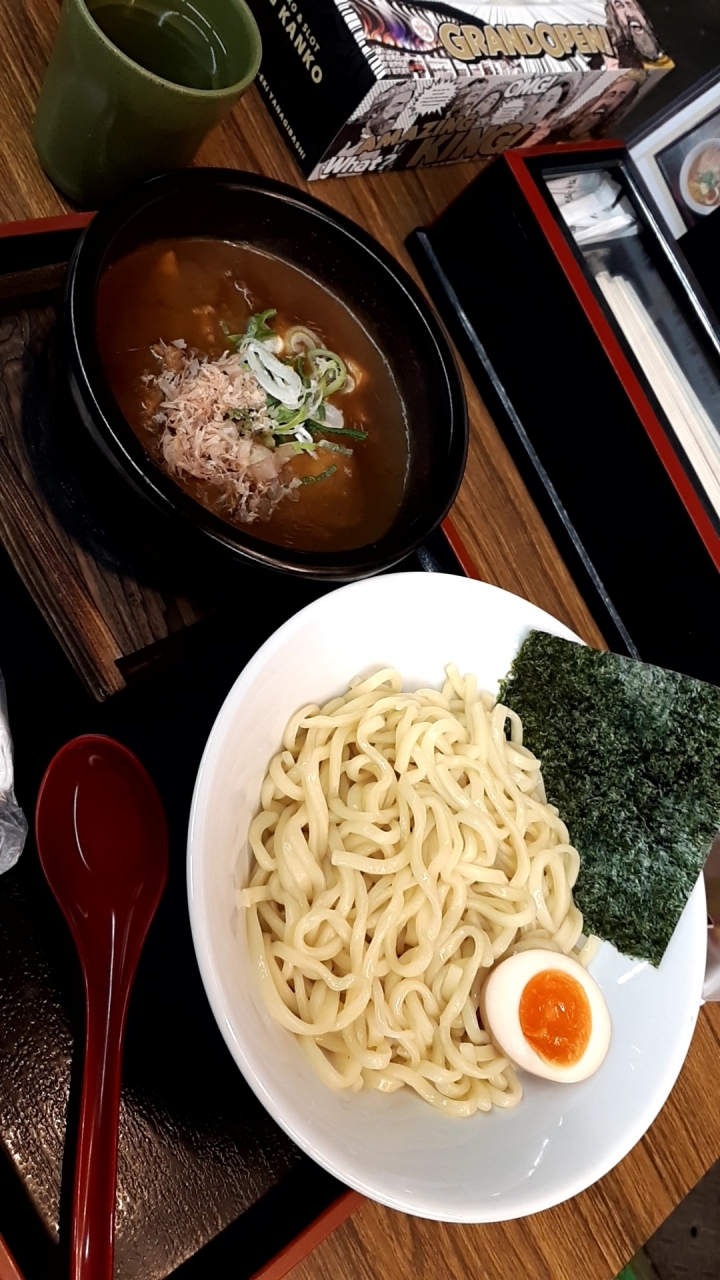 片言の外国人の男性店員さんに「カレーつけ麺 普通盛り」(税込800円也)を注文した。デカいホタテも入っており、カレーとマッチして、魚介類の臭みは全くなく、とても美味しく頂きました。