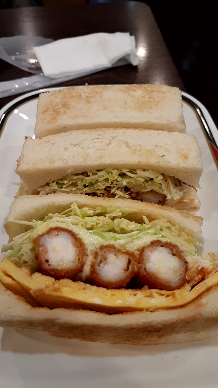 また、えびふりゃーサンドイッチの方も、メニュー写真と比べると明らかに劣って見えますが、味の方はまあまあ美味しかったが、値段との釣り合いは非常に疑問です。