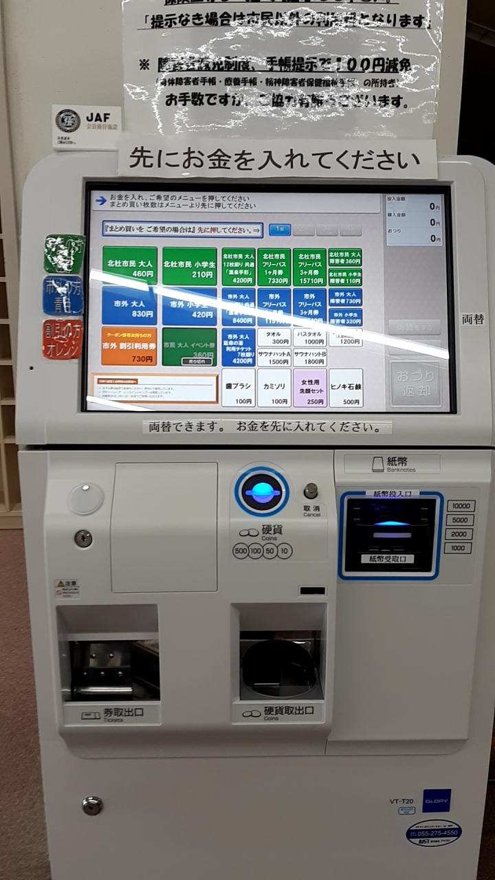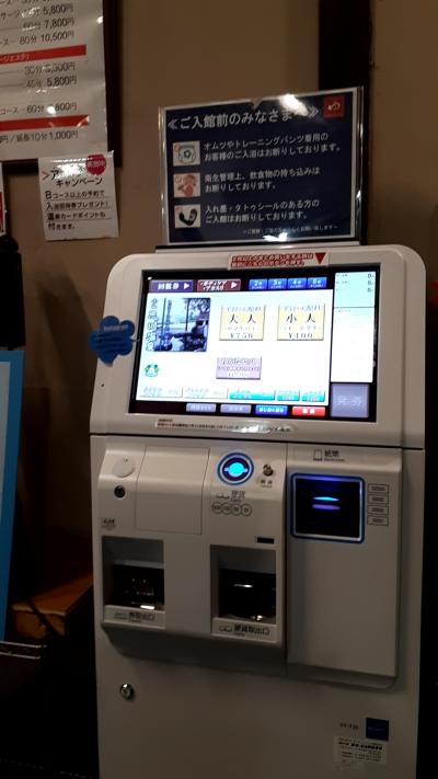 温泉施設に入ると、まずは券売機にてチケット購入。なお、県外の大人は830円也。ちなみに地元市民なら460円也。